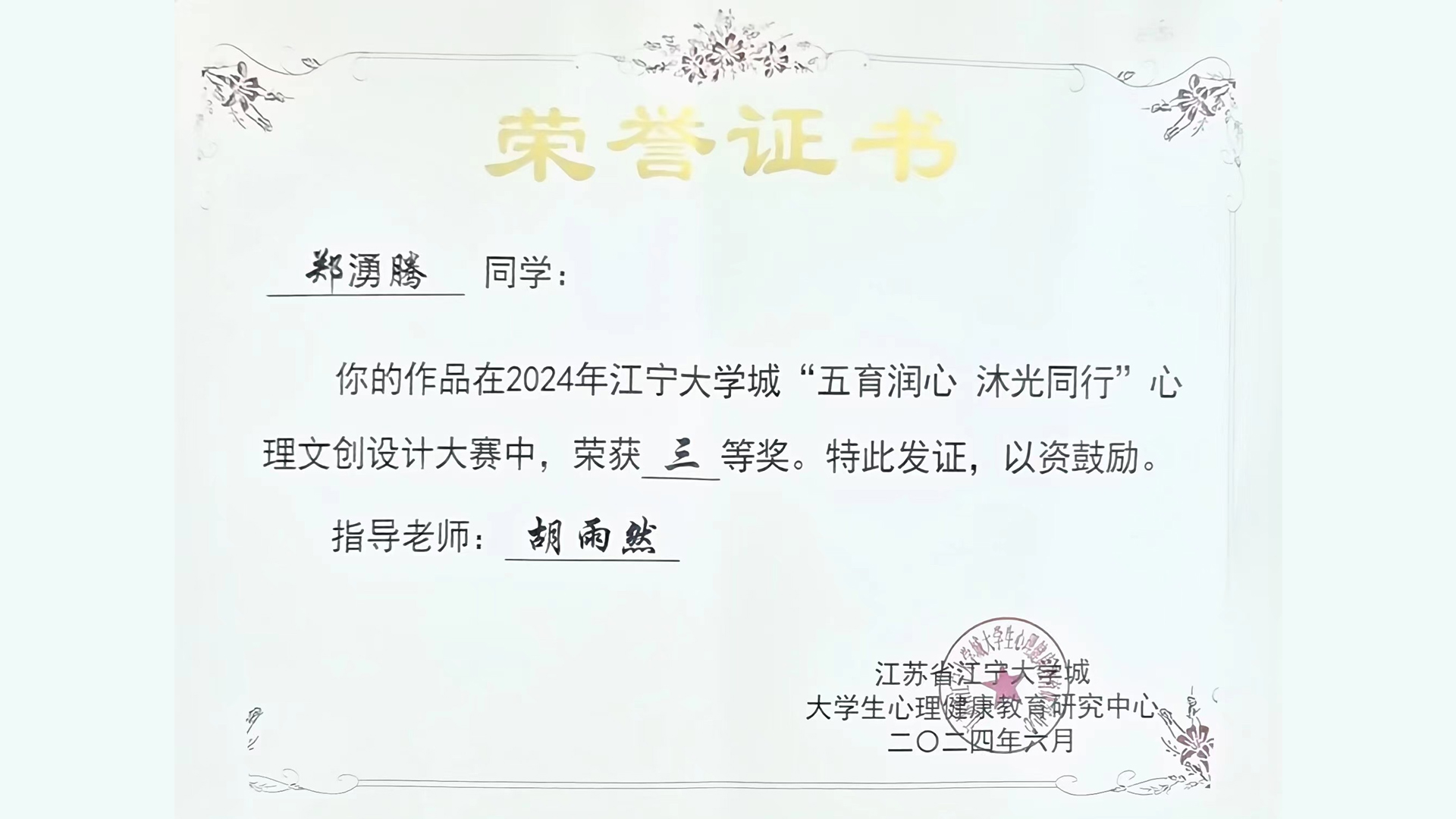 艺术设计与建筑工程系学生郑湧腾在正德有礼文创社团负责教师胡雨然的指导下,在2024年江宁大学城“五育润心 沐光同行”心理文创设计大赛中,荣获三等奖。