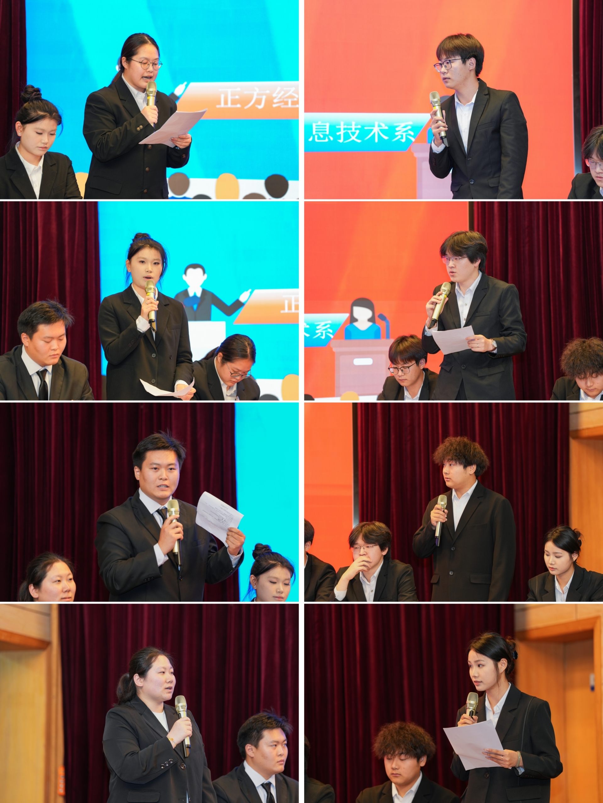 本届辩论赛分初赛、复赛、决赛,实行淘汰赛制,共六支队伍参加。辩题紧扣当下热点话题,各系学生同场论辩、同台竞技,思想碰撞,火花四溢。经过前期在一站式社区进行的比赛,电子与信息技术系和经济与管理系两支队伍的优秀辩手们脱颖而出,在决赛的舞台上进行了一场激烈的交锋。双方辩手针对辩题:“年轻人依赖AI工具是高效进化还是能力退化”展开激烈辩论。双方辩手围绕论点、引经据典、妙语连珠、旁征博引,现场气氛热烈而紧张。双方辩手势均力敌,现场氛围热烈高涨。