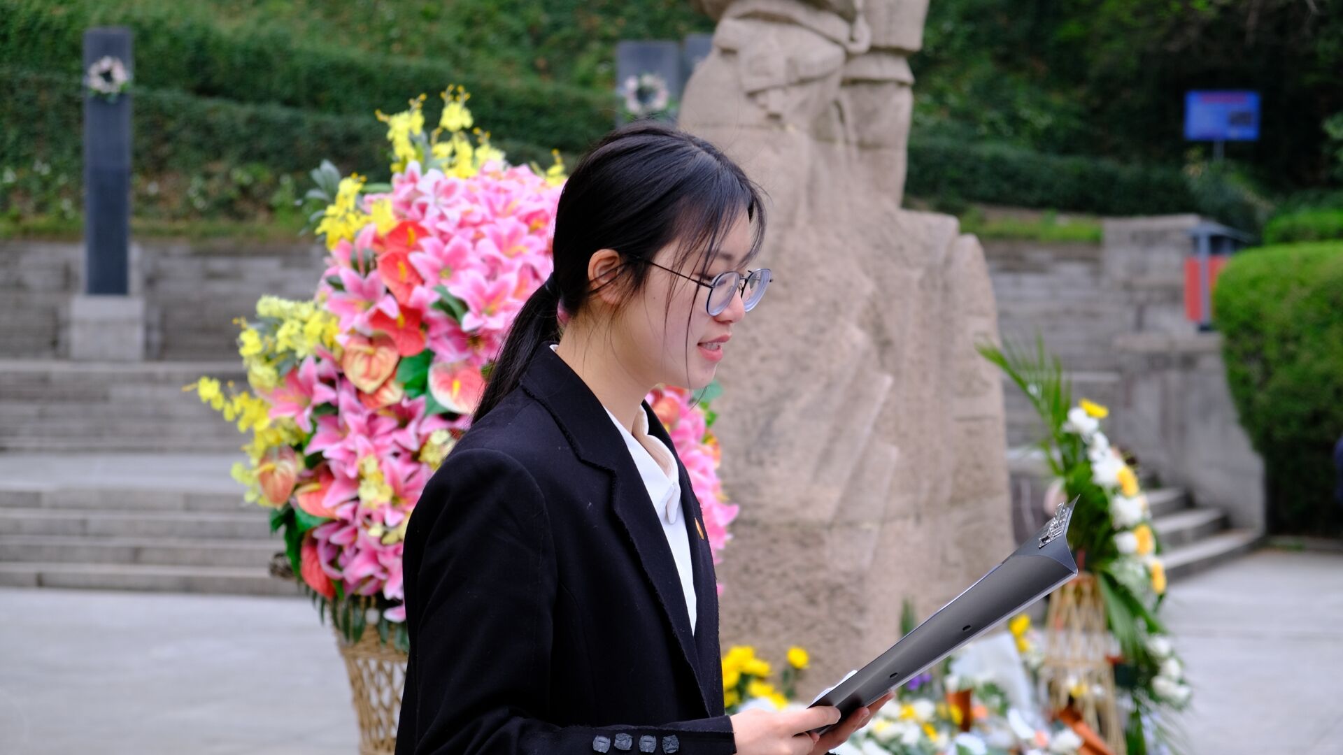 学生代表,经济与管理系学生会主席团成员王骁发言,她首先表达了对抗日航空先烈们的深切悼念和无限敬仰。然后,她分享了此次参观学习后的感受。最后,她指出作为新时代的青年、学生干部,要学习先烈矢志不渝的崇高追求,要弘扬先烈顽强拼搏的革命气魄,要践行先烈一心为民的赤子情怀。