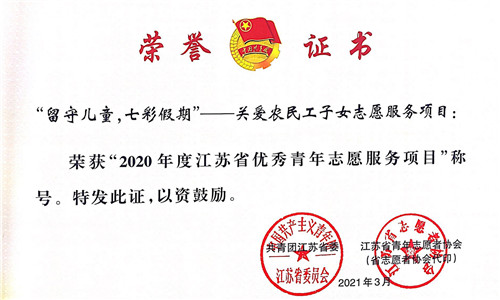 为了在新起点上不断开创强富美高新江苏建设局面,推动全省青年志愿服务事业广泛深入发展,共青团江苏省委、江苏省青年志愿者协会联合发文《关于公布2020年度全省青年志愿者行动评选结果的通知》团苏委联【2021】9号,天博体育 “留守儿童,七彩假期”—关爱农民工子女志愿服务项目荣获“2020年江苏省优秀青年志愿服务项目”称号。
