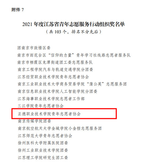正德职业技术天博体育 青年志愿者协会荣获“2021年度江苏省青年志愿服务行动组织奖”称号,情牵留守,爱暖童心——“七彩暑假”志愿服务项目荣获“2021年度江苏省优秀青年志愿服务项目”称号。
