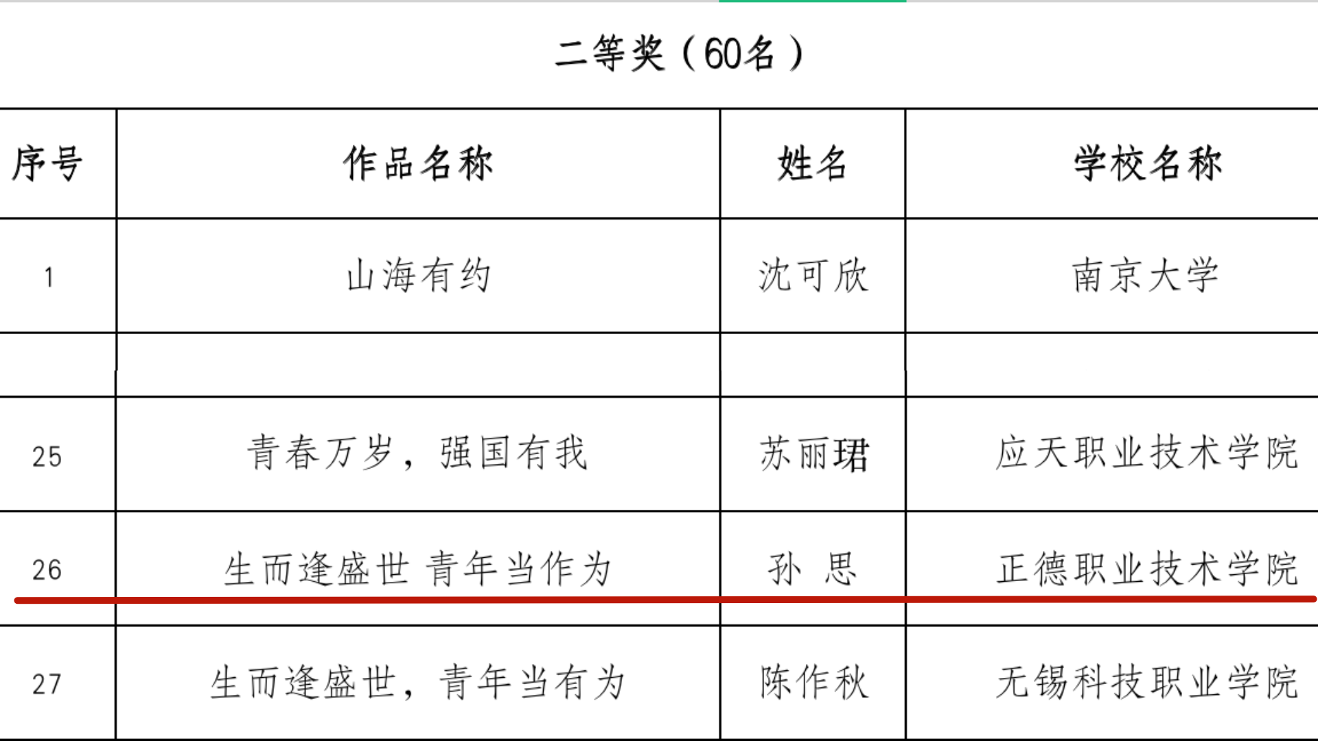 近日,由省委教育工委、省教育厅主办的“奋进新征程,青春勇担当”全省大学生征文比赛结果揭晓,天博体育 艺术设计与建筑工程系孙思同学的作品《生而逢盛世 青年当作为》(指导教师:崔杰)荣获省征文比赛二等奖。