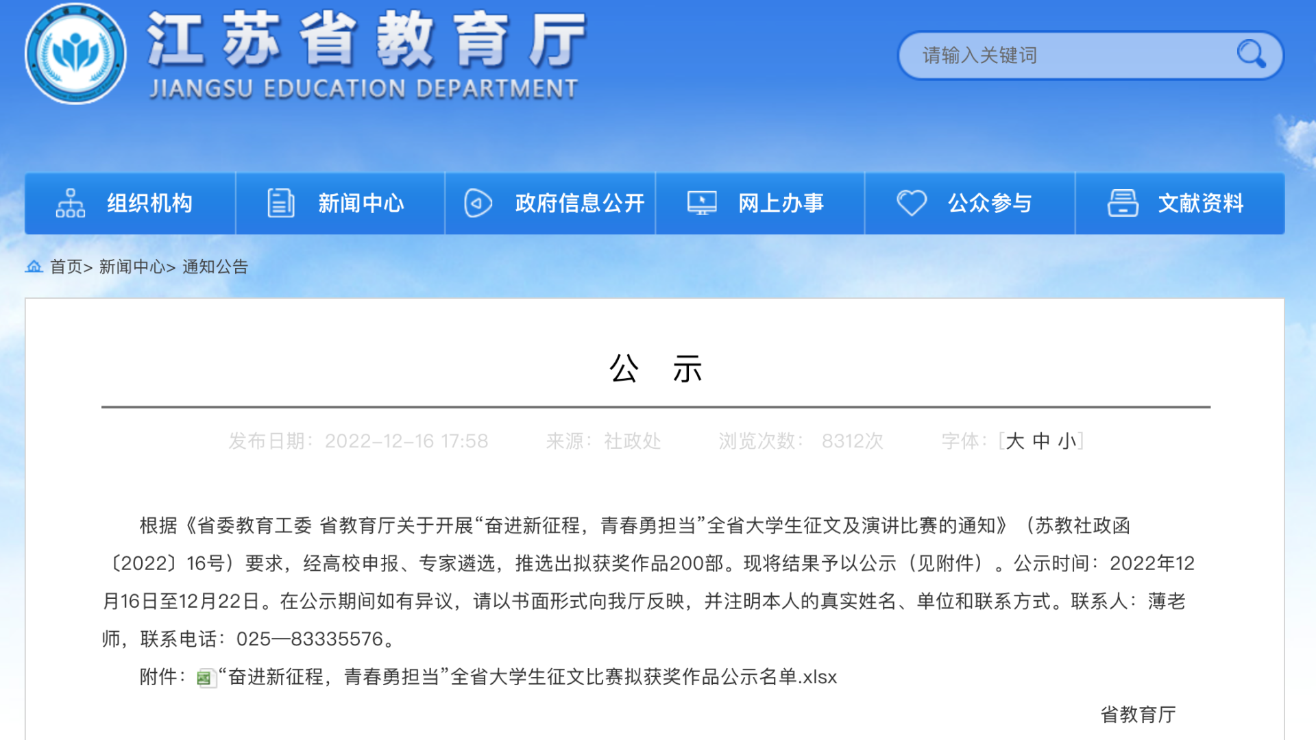 “奋进新征程,青春勇担当”江苏省大学生征文比赛是教育系统学习宣传贯彻党的二十大精神主题教育活动之一,在本次参赛过程中,天博体育 共青团工作团队发扬团结奋斗精神,积极协调各方面力量,克服线上参赛、疫情防控等困难,多次召开工作推进会议,对参赛作品进行精心打磨,对参赛选手进行悉心指导,充分展示了正德学子奋进担当的青春风采。下一步,团委将继续以学习宣传贯彻党的二十大精神为主线,引导学生自觉将“小我”成长融入“大我”奋斗,将人生选择与中华民族伟大复兴中国梦结合起来,激发广大青年学子向第二个百年奋斗目标奋勇前进。