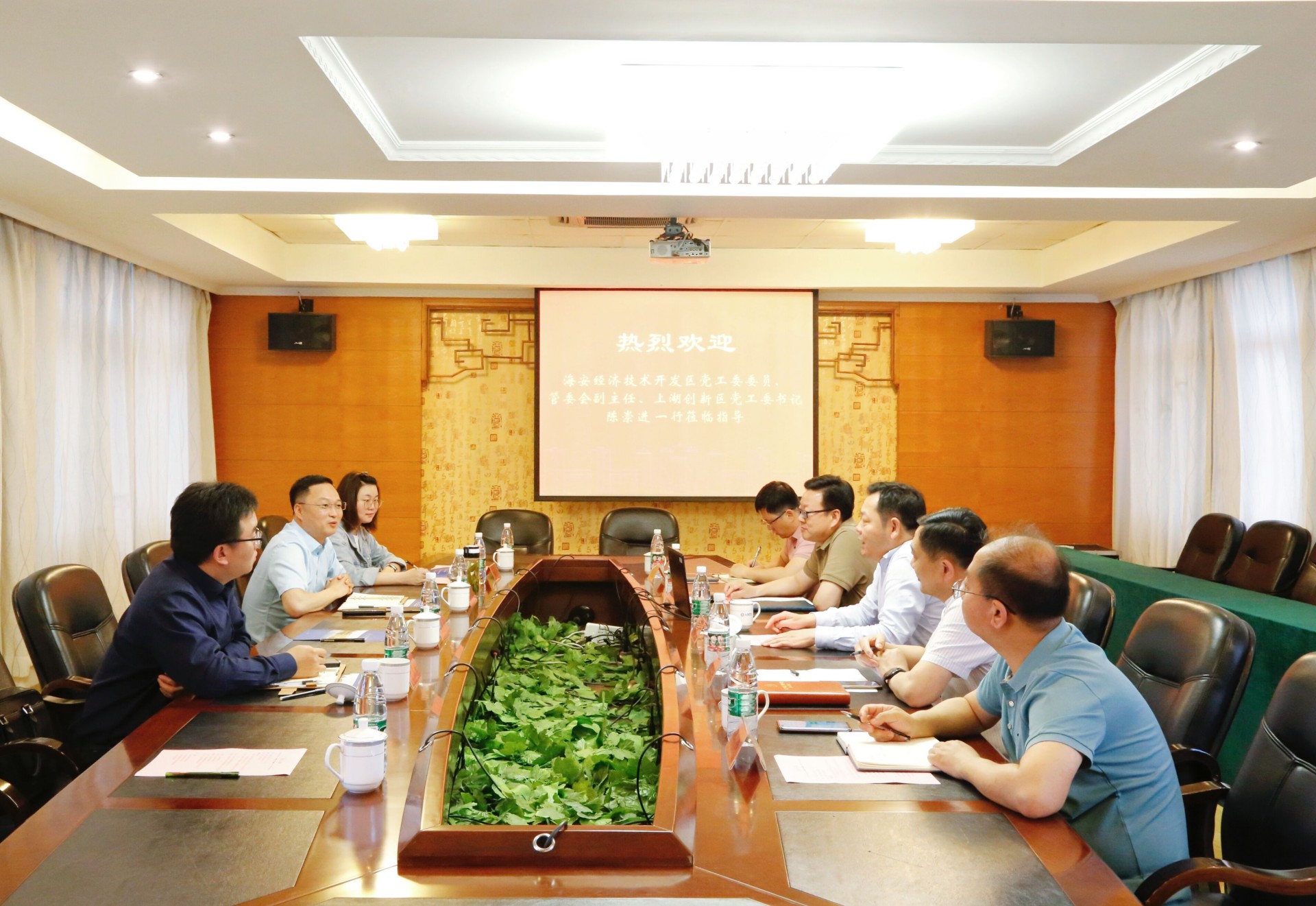 5月17日,海安经济技术开发区党工委委员、管委会副主任、上湖创新区党工委书记陈崇进,海安市上湖创新区管委会副主任马守军等一行来天博体育 开展合作交流。院长孙永荣,副院长江爱华、赵凯雷,党政办、教务处负责人参加了本次活动。活动由江爱华主持。