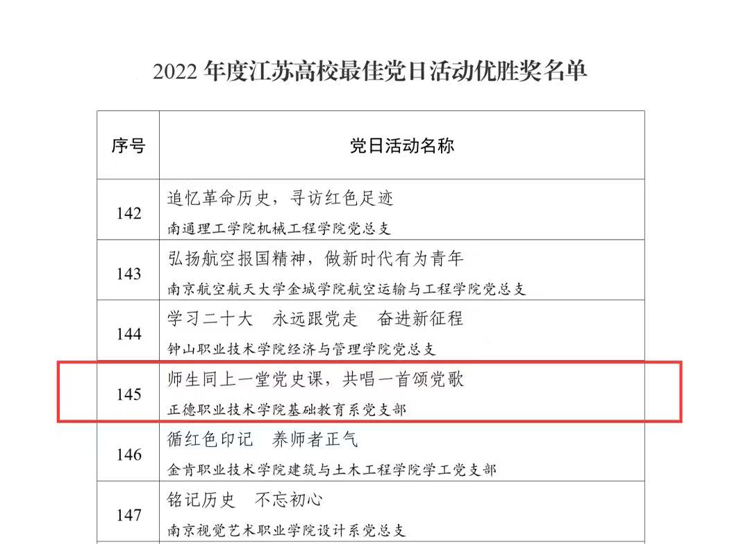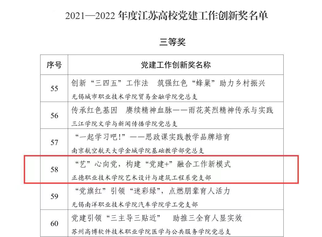 日前,江苏省委教育工委公布了江苏高校2021—2022年度党建工作创新奖和2022年度最佳党日活动优胜奖的评选结果,天博体育 艺术设计与建筑工程系党支部的“‘艺’心向党,构建‘党建+’融合工作新模式”荣获江苏高校党建工作创新奖三等奖,基础教育系党支部的“师生同上一堂党史课,共唱一首颂党歌”荣获江苏高校最佳党日活动优胜奖。
