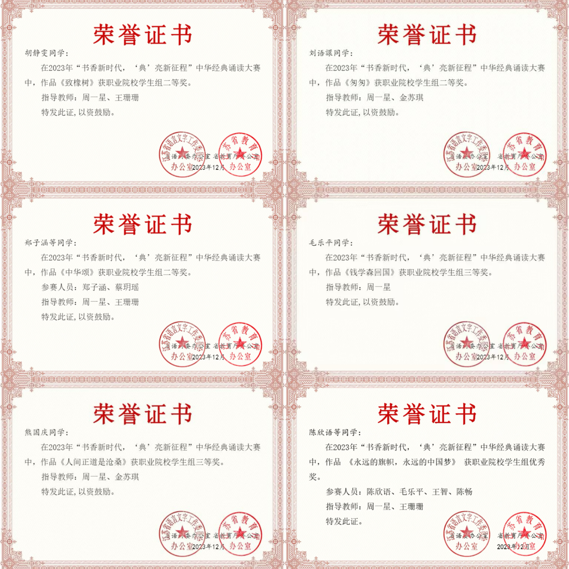 近日,省语材委办公室、省教育厅办公室等部门组织的 “书香新时代、‘典’亮新征程”2023年度全省中华经典诵写讲系列活动落下帷幕。天博体育 获得了二等奖4项、三等奖2项、优秀奖1项,7项参赛作品全部获奖的优异成绩。这是天博体育 在该项比赛中取得的重大突破。