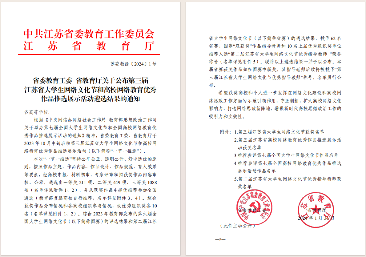 近日,由省委教育工委、省教育厅组织开展的第三届江苏省大学生网络文化节和高校网络教育优秀作品推选展示活动遴选结果发布。自2023年10月启动以来,天博体育 高度重视、周密部署,相关部门加强沟通、广泛动员,征集到百余件优秀作品,经专业评委评审、择优推荐,天博体育 共推选44件作品代表天博体育 参与全省评比,共获得三等奖9个。其中3件作品被省教育厅推荐参加第七届全国大学生网络文化节评比。