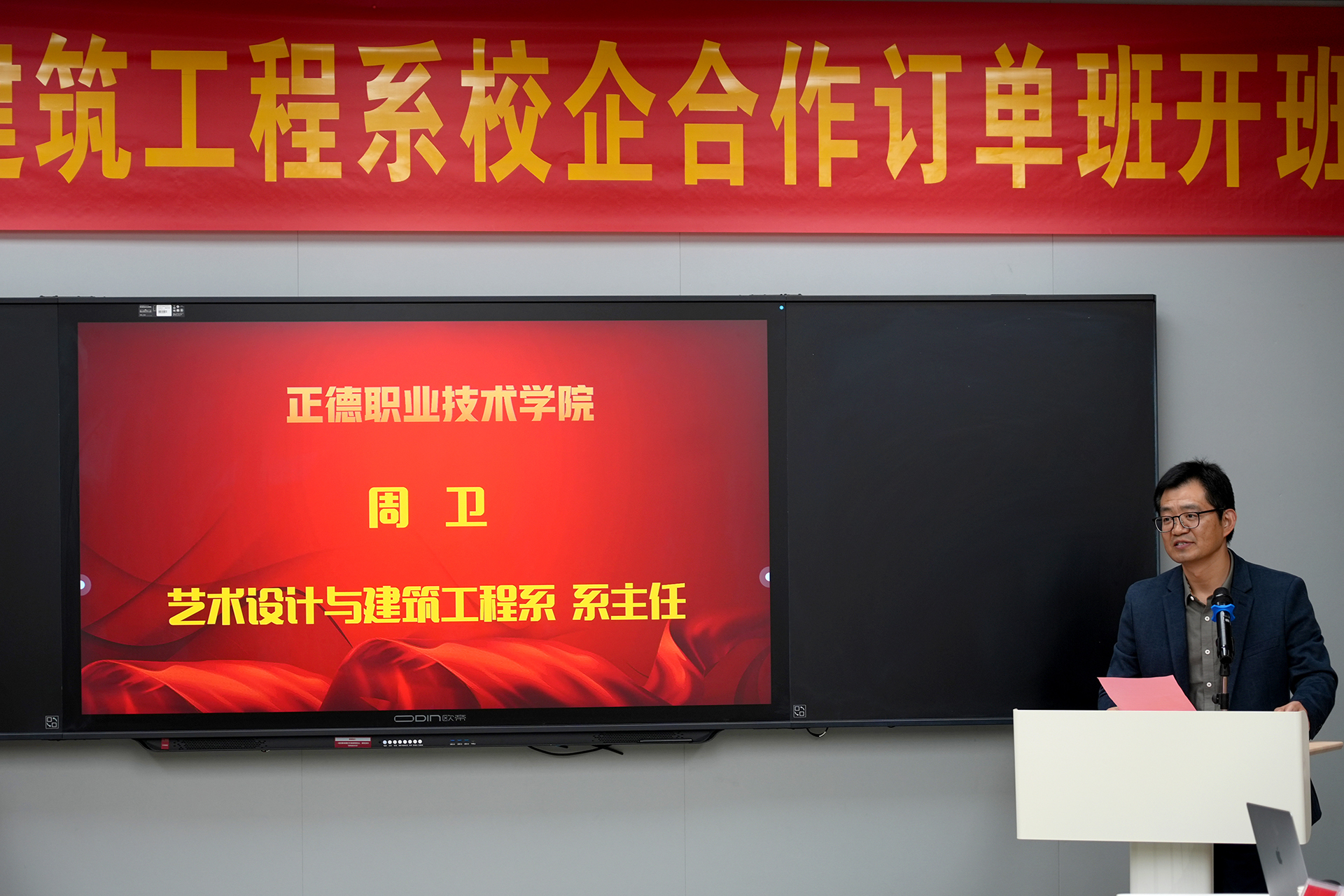 仪式开始,与会人员共同观看了两家公司的企业宣传片,深入了解了它们在装饰设计、智能科技领域的卓越成就和发展愿景。随后,艺术设计与建筑工程系主任周卫上台致辞,对两家公司长期以来对天博体育 人才培养工作的支持和帮助表示了衷心的感谢,并期待未来双方能在更多领域展开深入合作,共同推动人才培养质量的提升。