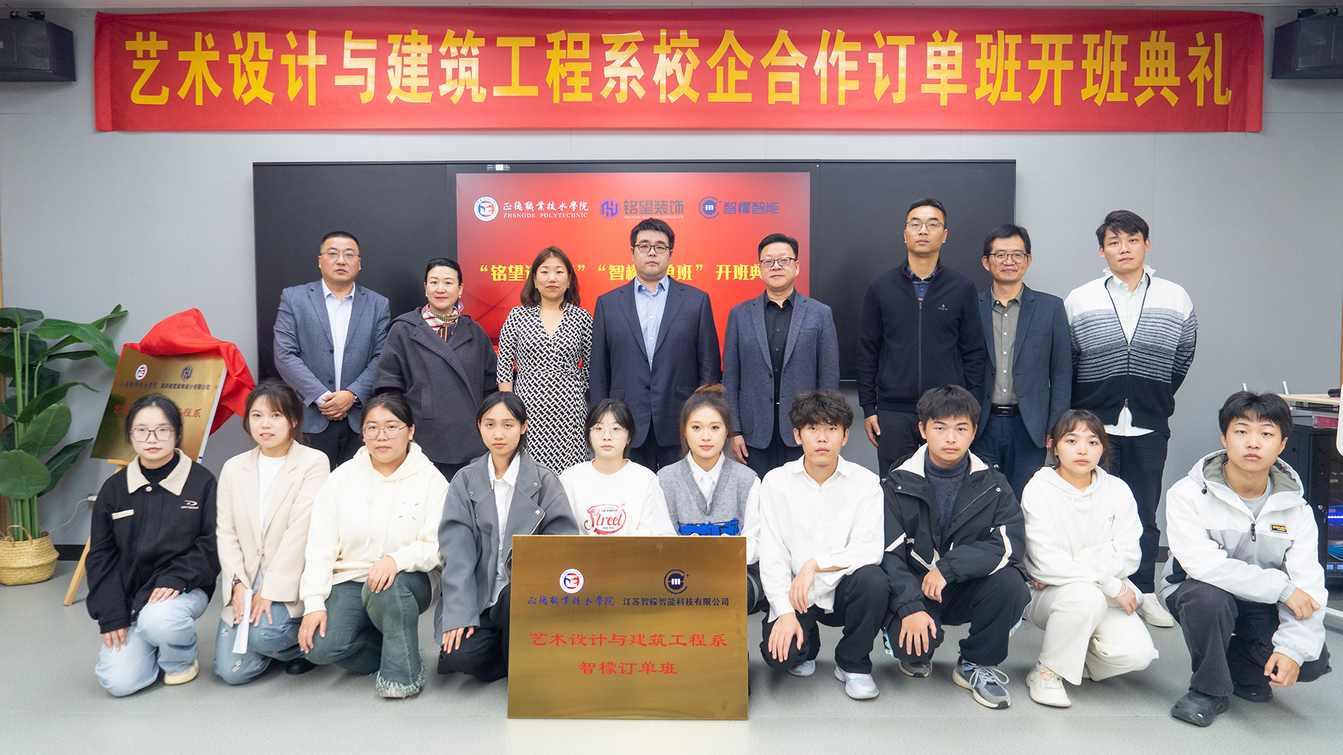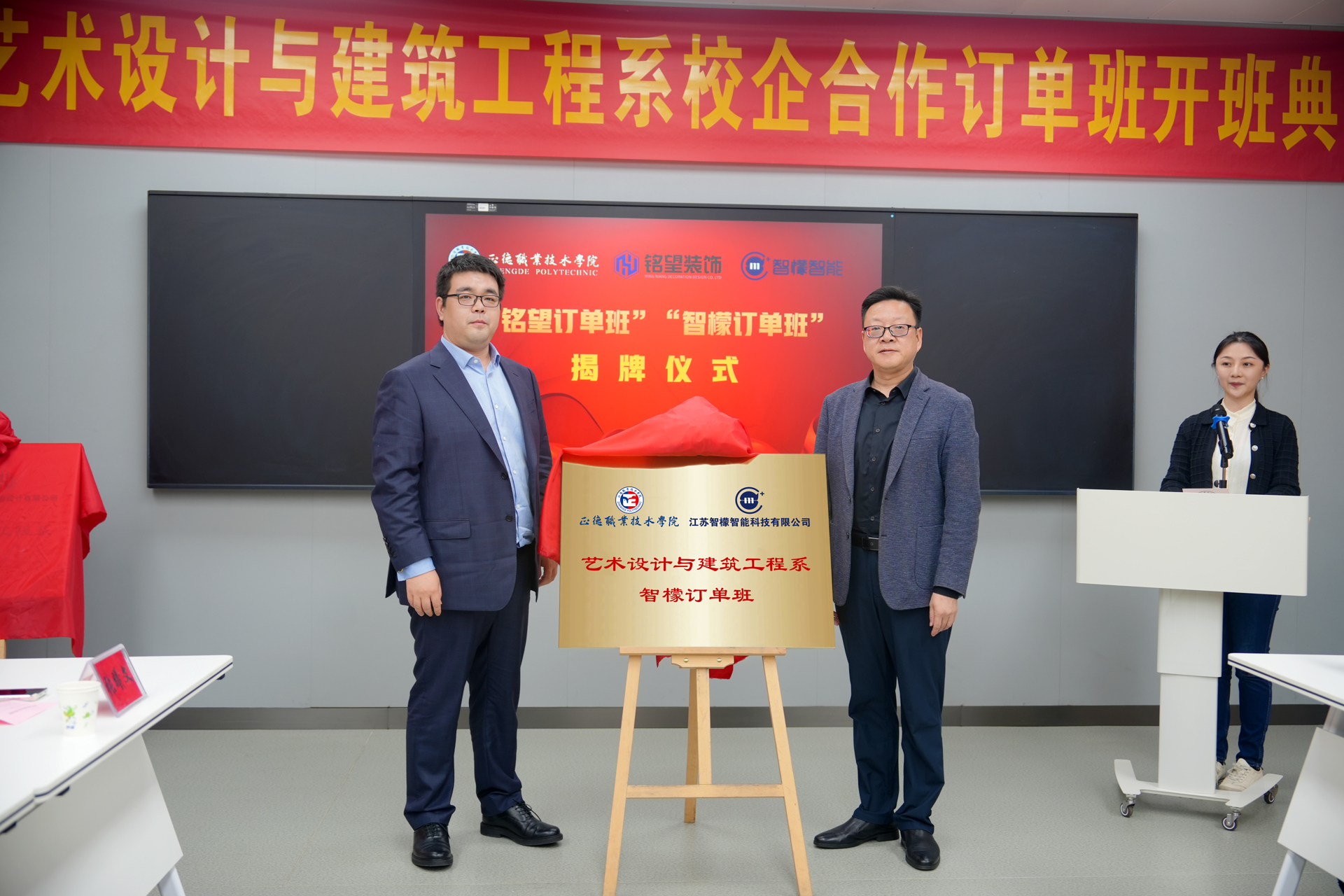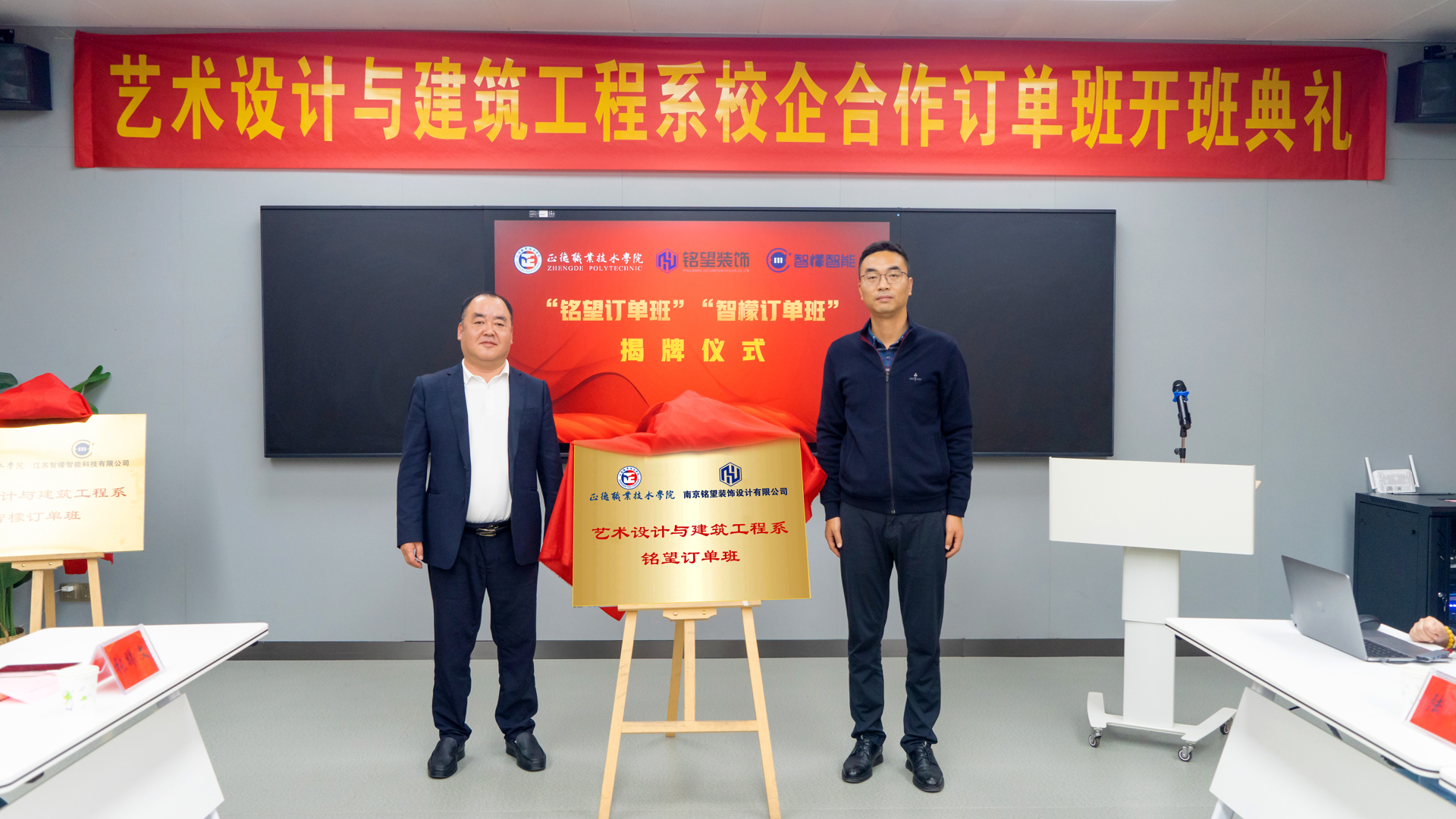 10月31日下午,艺术设计与建筑工程系成功举办了与南京铭望装饰设计有限公司、江苏智檬智能科技有限公司合作的“铭望订单班”与“智檬订单班”揭牌典礼。江苏智檬智能科技有限公司董事长温砚、南京铭望装饰设计有限公司总裁金海、天博体育 副院长赵凯雷,院长助理、招生就业处处长王墀,以及校企双方领导、订单班专业教师及学生代表。一同参加此次揭牌仪式。