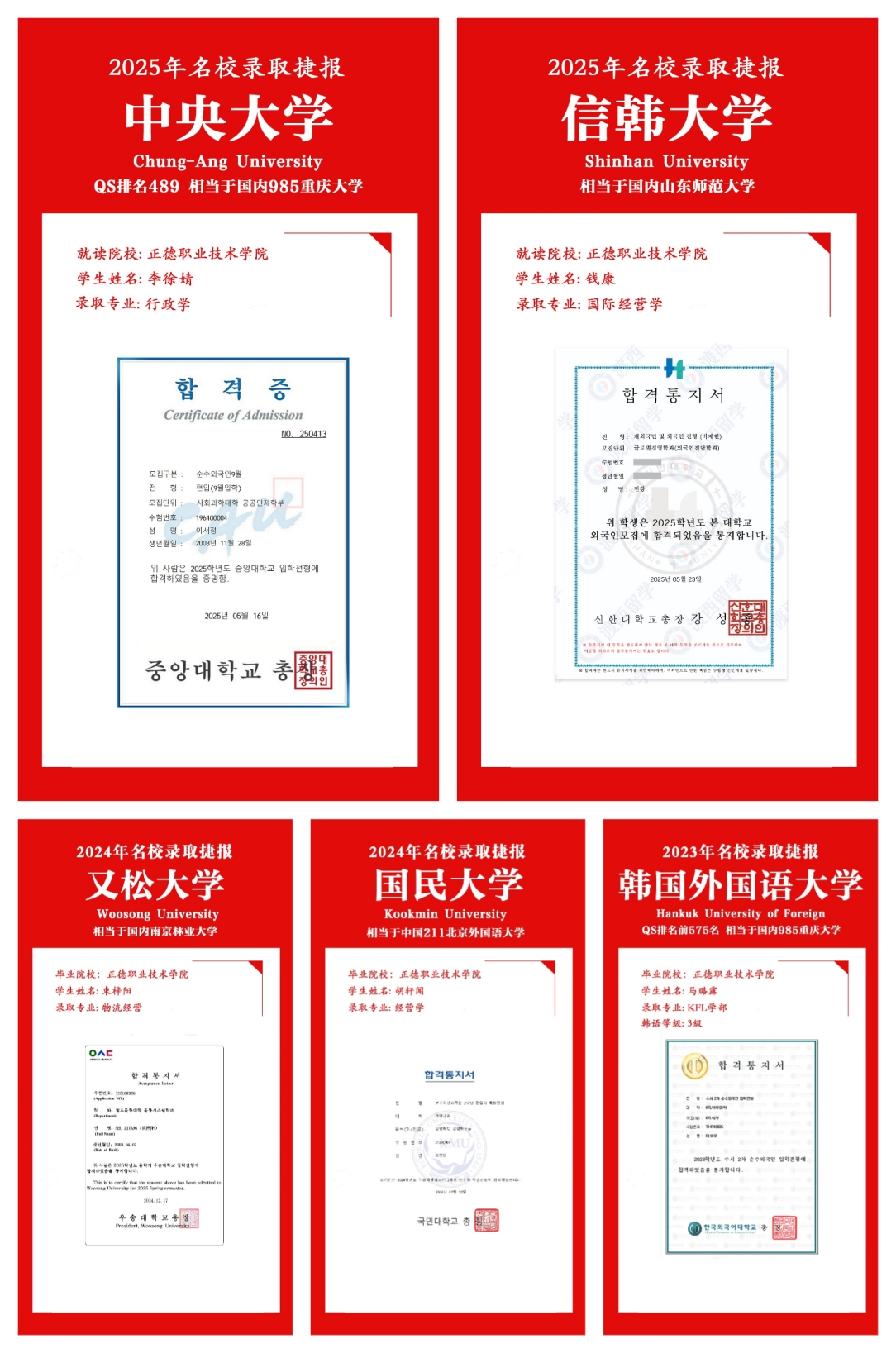 此次录取李徐婧同学的韩国中央大学是韩国BK21工程卓越高校、世界五百强高校、亚太国际贸易教育暨研究联盟(PACIBER)、亚太国际教育协会成员。而录取钱康同学的信韩大学是一所位于韩国京畿道的私立综合性大学,在校生超2万名,学科覆盖人文、社科、理工等领域。另外三名同学也分别被韩国又松大学、韩国外国语大学、韩国国民大学录取,这三所大学在韩国乃至国际上都具有较高的声誉,其教育水平与国内重庆大学、厦门大学、南京林业大学、山东师范大学等高校相当。