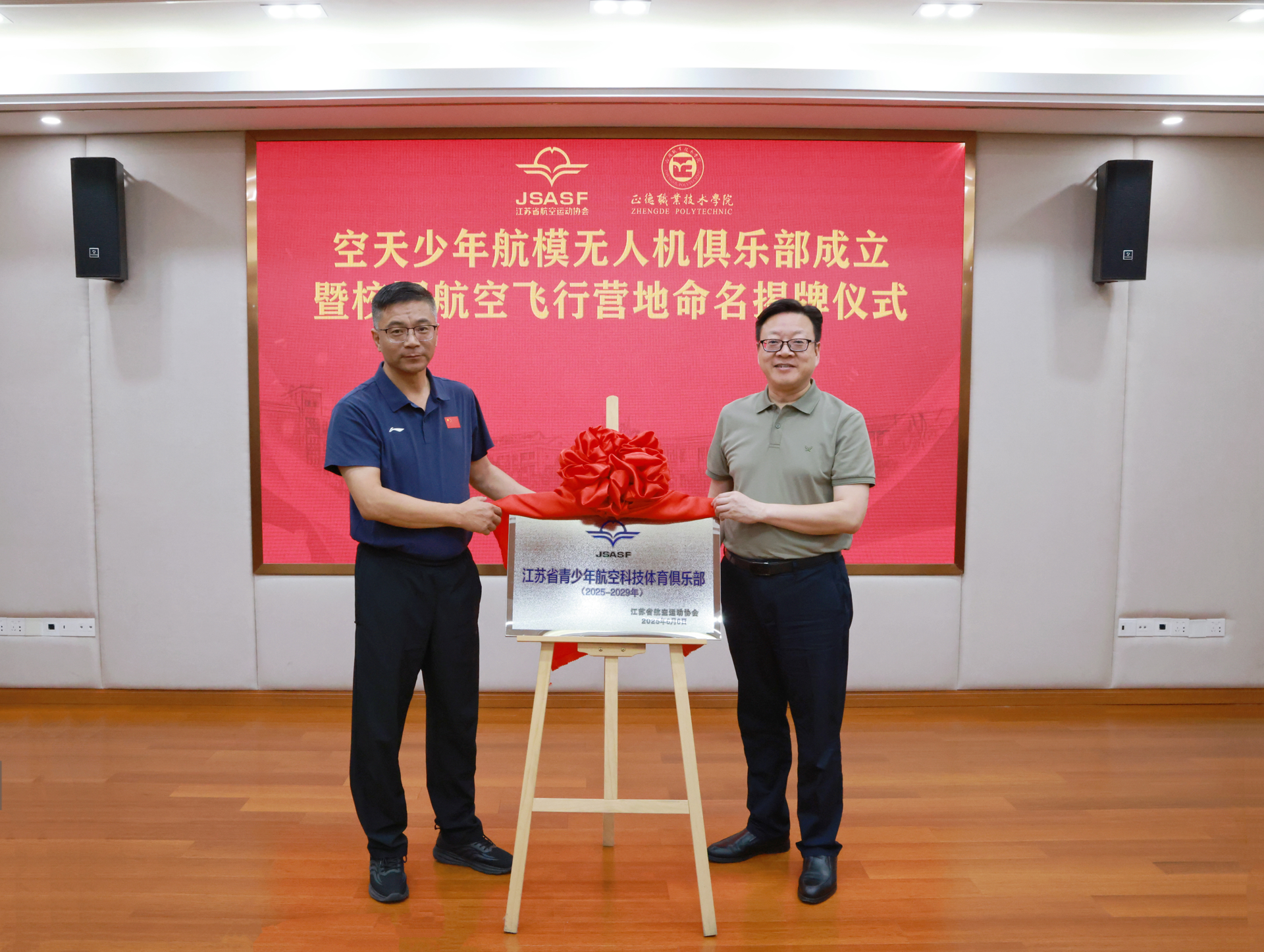 6月10日下午,江苏省航空运动协会会长陈春宁、秘书长王剑、办公室主任曹佳诚一行来天博体育 ,为天博体育 “空天少年航模无人机俱乐部”“天博体育 航空飞行营地”揭牌。天博体育 院长孙永荣、副院长赵凯雷,职业技能培训中心主任杨卫东、电子与信息技术系主任刘佳、航模队主教练袁伟出席了揭牌仪式。仪式由院长助理兼党政办公室主任王伟主持。