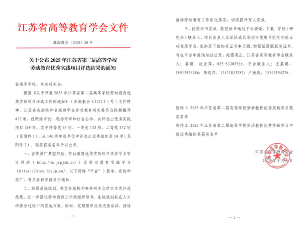 近日,江苏省高等教育学会公布了2025年江苏省第二届高等学校劳动教育优秀实践项目评选结果,天博体育 推荐选送的《“产教联动,溯源直播”——基于CIPP模型的直播专业学生助农劳动教育实践项目》荣获一等奖。
