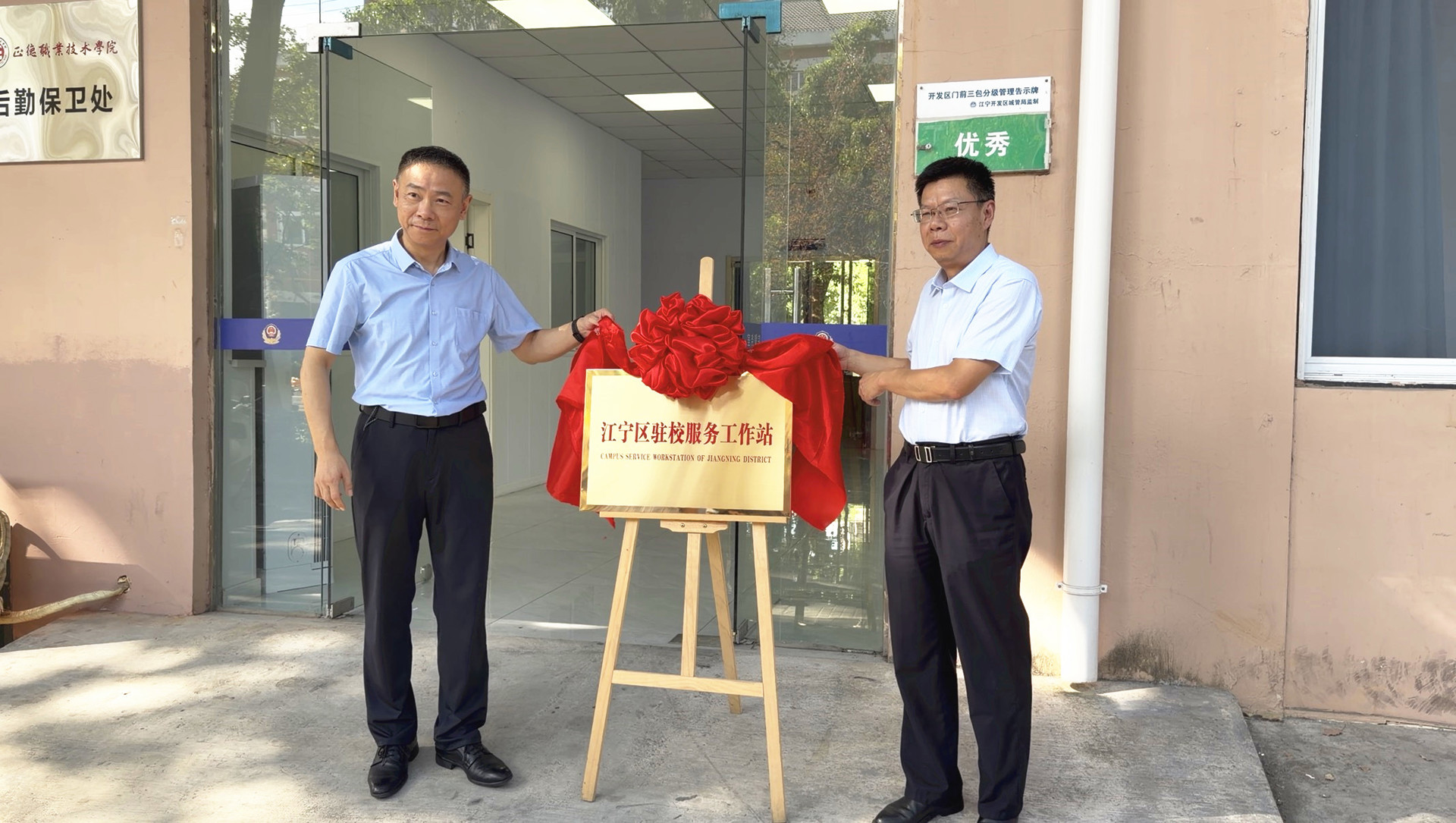 仪式在庄重热烈的氛围中开始。夏玉龙与高斌共同为“江宁区驻校服务工作站”揭牌。红绸揭下的瞬间,标志着校地协同、资源整合的天博体育 法治建设与平安建设工作开启了新篇章。