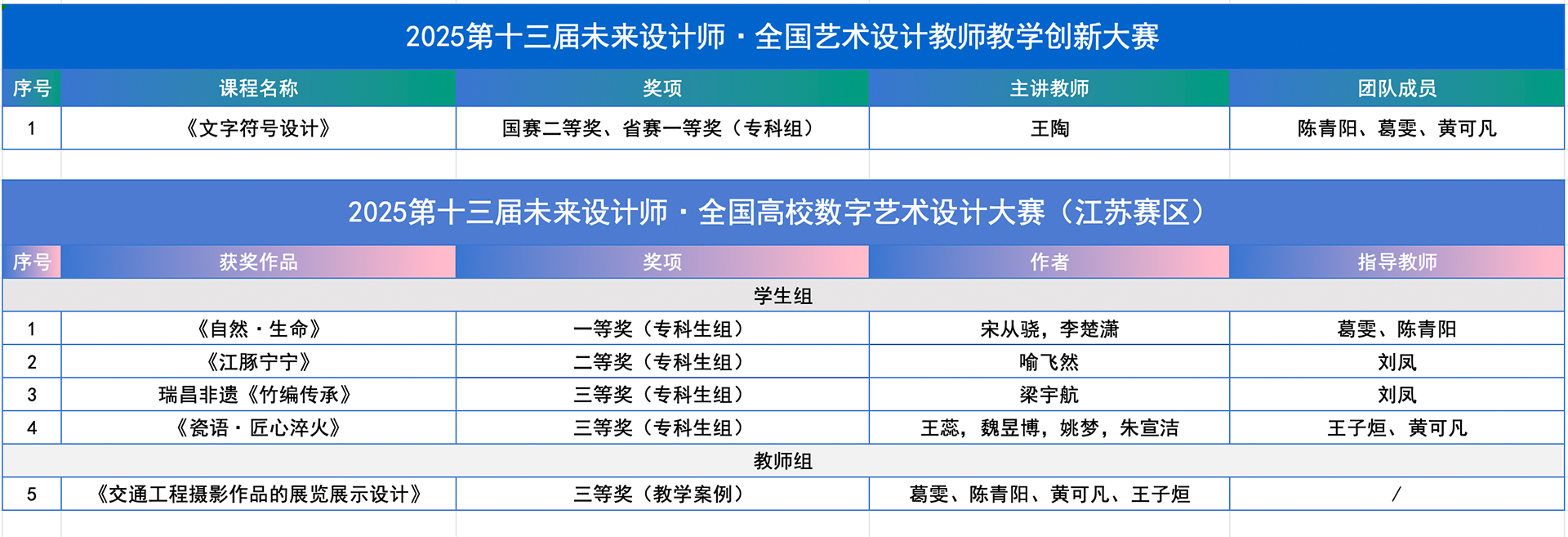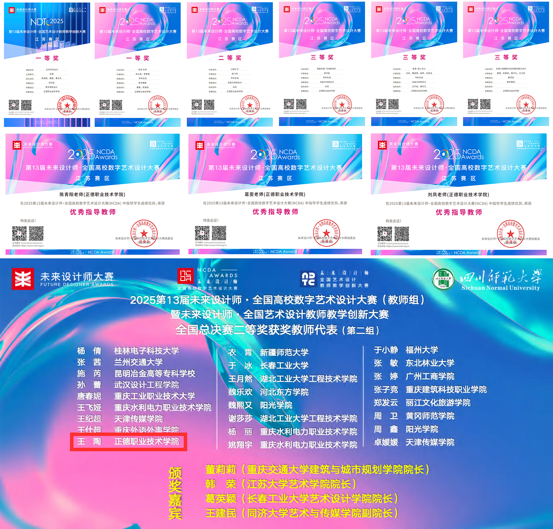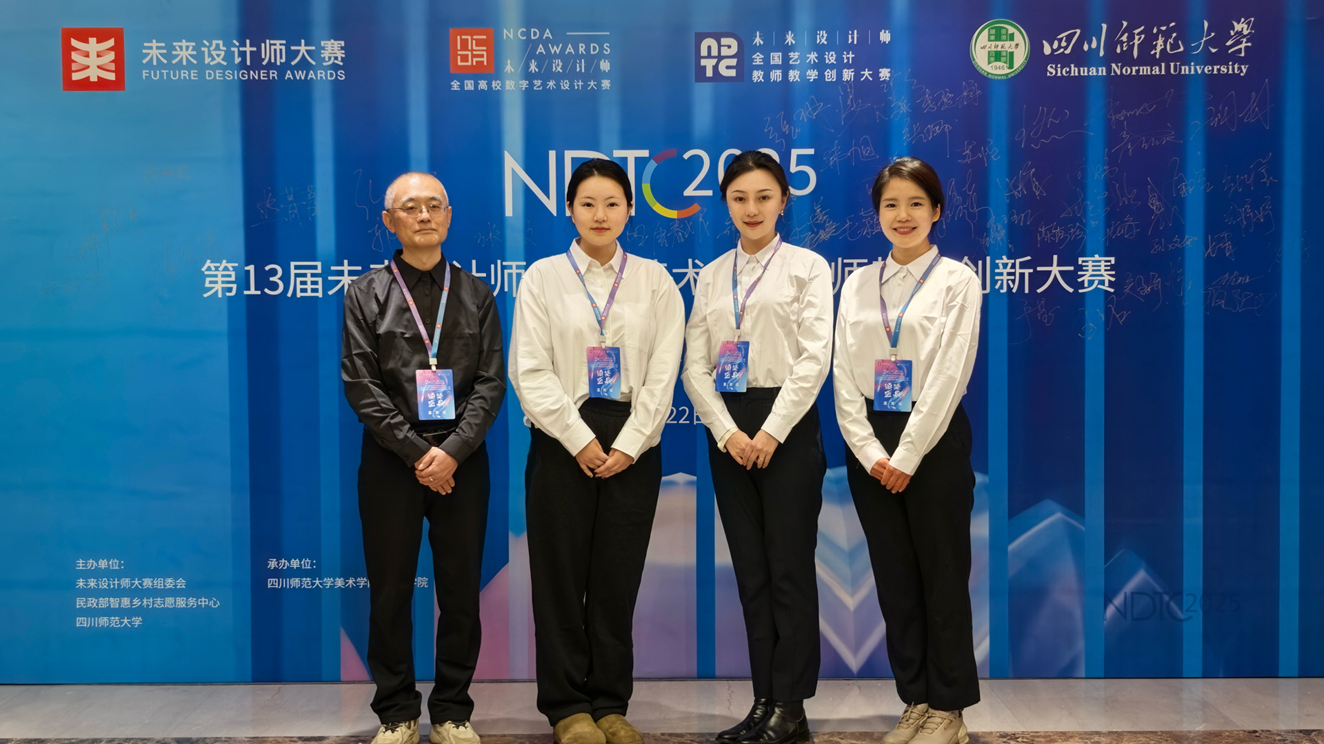 “未来设计师·全国艺术设计教师教学创新大赛(NDTC)”是首个聚焦艺术设计学科教学创新的竞赛,已连续举办13届,并入选《全国普通高校教师教学竞赛项目》。2025年天博体育 艺术设计与建筑工程系首次组织教师团队参赛,由王陶、陈青阳、葛雯、黄可凡组成的教师团队凭借课程《文字符号设计》在江苏省赛区脱颖而出,荣获一等奖,并成为江苏省赛区唯一获得国赛资格的高职院校团队。经过国赛多轮严格的专家盲评、现场展示和答辩,最终荣获全国总决赛二等奖,充分展现了天博体育 在艺术设计教学改革与课程创新方面的深厚积累。