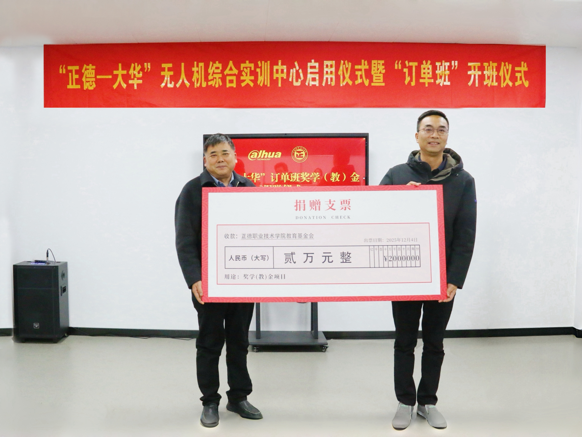 在全场嘉宾与师生的共同见证下,孙永荣、刘晓勇、赵凯雷、官建军共同点亮灯柱,为“正德-大华”无人机综合实训中心按下启用键。随后,方鸣子与刘佳共同为“正德—大华”订单班揭牌;官建军代表企业向天博体育 捐赠奖学(教)金,为师生成长与教学发展提供坚实保障。订单班班主任及学生代表分别发言,表达了对校企共建平台的感谢之情,承诺将珍惜学习机会,刻苦钻研专业知识、锤炼过硬职业技能,不负校企期望,努力成长为符合产业需求的优质技术技能人才。