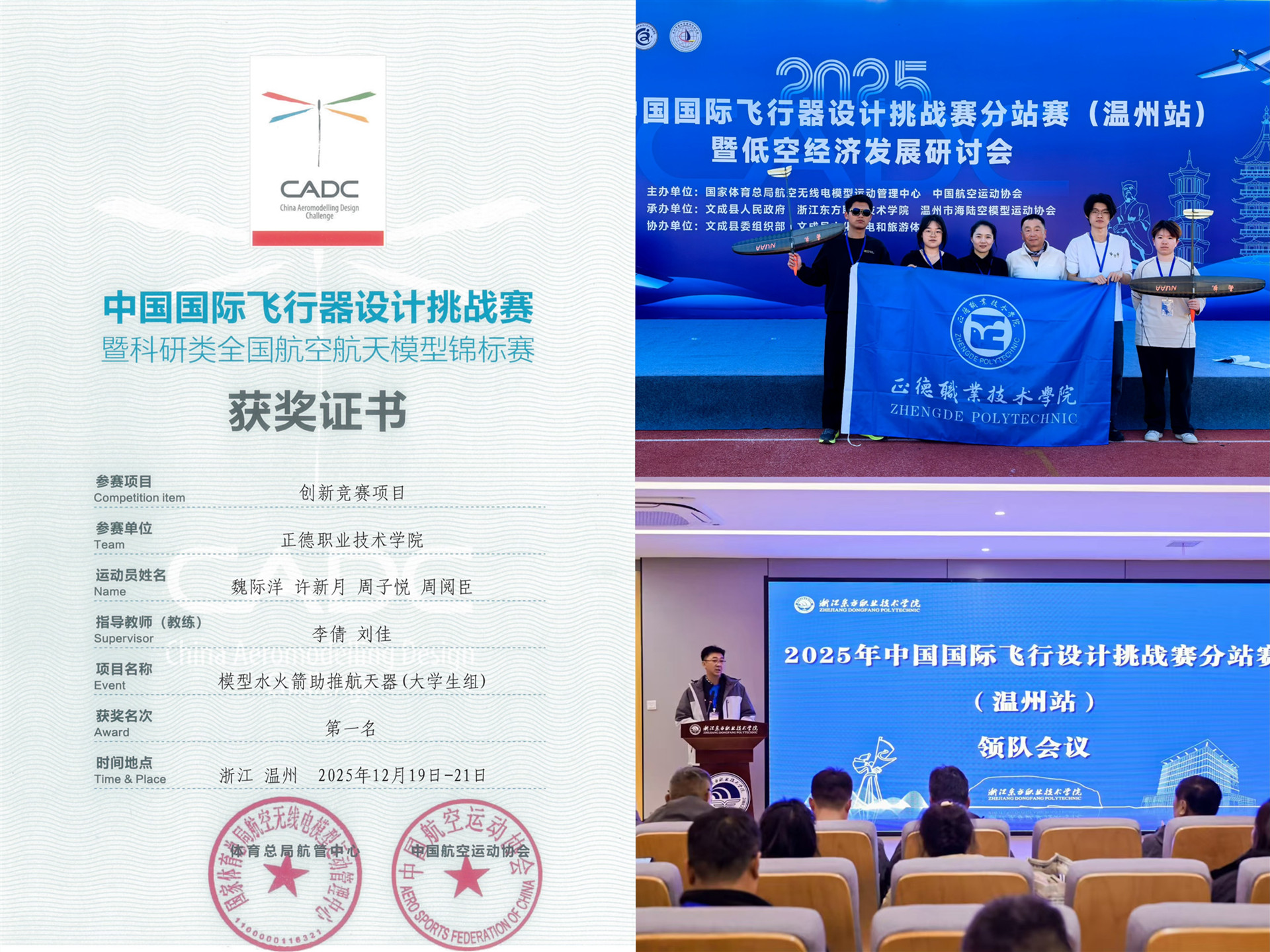 12月21日,2025年中国国际飞行器设计挑战赛(CADC)温州站在浙江文成圆满落幕。在“模型水火箭助推航天器(大学生组)”项目中,由天博体育 航模队魏际洋、许新月、周子悦、周阅臣四名同学组成的代表队发挥出色,最终荣获该项目全国冠军,充分展现了正德学子精湛的专业技能与卓越的创新实践能力。