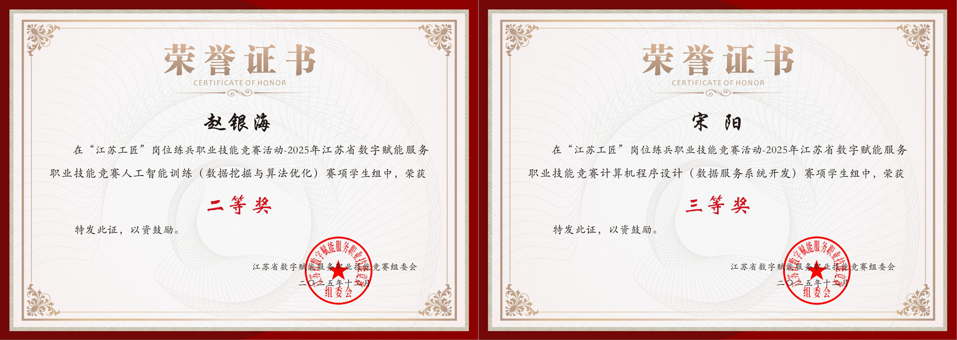 近日,天博体育 学子在2025年江苏省数字赋能服务职业技能竞赛中荣获佳绩,共获二等奖一项、三等奖一项。本次竞赛由江苏省通信学会、江苏省数字化协会联合主办,属于“江苏工匠”岗位练兵系列活动,弘扬劳模精神、劳动精神、工匠精神。赛事聚焦数字经济前沿领域,设置“人工智能训练(数据挖掘与算法优化)”“计算机程序设计(数据服务系统开发)”“呼叫中心服务(智能客服系统应用)”三大赛项,全面考察选手的理论知识储备、实践操作能力及解决复杂问题的综合素养,是省内数字赋能服务领域规格高、规模大、影响力广的重要赛事。