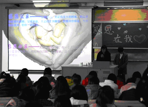 活动中,各团支部学生干部们紧紧围绕活动主题,结合专业和班级特点,通过演讲、讨论、签名、诗歌朗诵等活动形式,把活动主题融入到学生的日常教育管理中。123301班和123303班团支部围绕感恩父母开展了“感恩在我心”活动。同学们通过讲述感恩节的由来,借助“你对父母知多少”的环节设计,在讲述父母点点滴滴的同时,引发了同学们对爱和感恩的深深思考。随后,同学们来到创新楼广场用蜡烛摆出了巨大的心形,并在心形中摆出“父母”二字,伴随着动人的歌曲,全体同学写下了对父母的祝福贴在“爱心墙”上,遥寄对父母的爱与感恩。