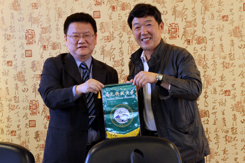 院长助理李作民(右)接受侨光科技大学赠送的校旗