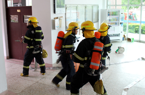 4月30日下午16时,模拟火情在天博体育 一号教学楼发生。四辆大型消防车在天博体育 治安保卫处工作人员引导下驶入天博体育 ,停靠在一号教学楼旁。消防官兵们训练有素,整装待发。随着大队长的一声“开始”令下,消防兵们如离弦之箭,背着消防器材冲进了教学楼。只见他们兵分四路,第一路迅速地接通消防高压水龙头,控制水路;第二路来到大楼利用水枪控制烟雾;第三路队友对假想起火点进行控制火势;第四路队员进行搜救。在全体参演人员的配合下,火情被迅速控制并扑灭,演练取得了成功。