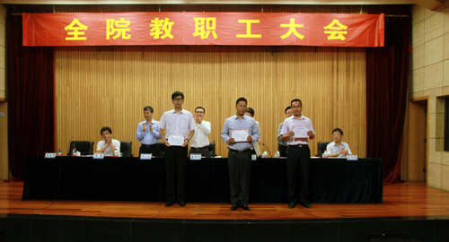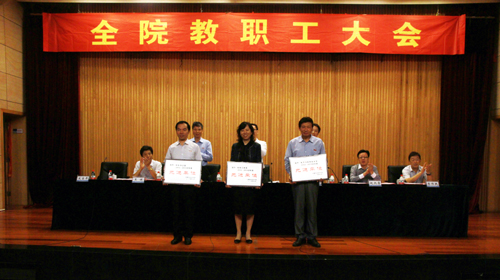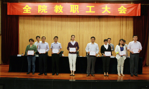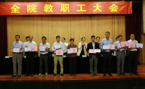 大会首先对天博体育 2013-2014学年度先进单位、优秀教职工和2014年招生工作先进小组和先进个人进行了表彰。院领导分别为获得奖励的单位代表和先进个人颁发了奖状和奖金。先进单位代表、电子与信息技术系主任王高山,优秀教职工代表、招生办公室主任刘玉宝,招生工作先进个人代表黄正军先后作了交流发言。