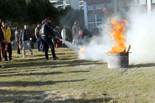 保卫处魏兆春处长向参加培训的师生员工们示范了干粉灭火器的正确操作方法。在魏处长认真细致的讲解之后,点火员点燃柴堆,制造火情场景,参训人员按照要领依次有序地进行灭火操作,只见他们将灭火器喷射干粉对准火焰根部扫射,燃起的火焰很快被扑灭。现场很多师生表示这次演练让他们了解了如何使用灭火器,遇到初起火情也知道该怎么处理了。