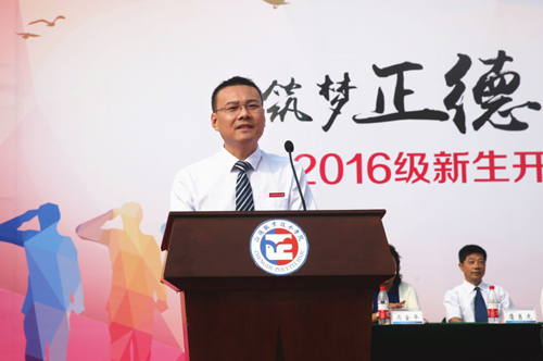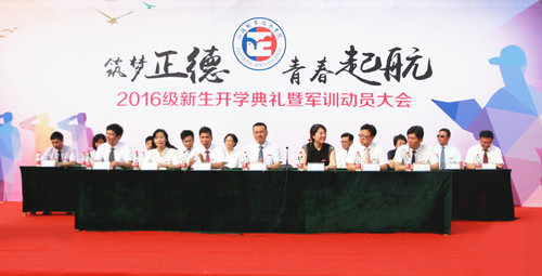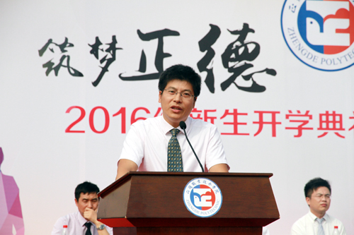 9月14日上午,天博体育 隆重举行“筑梦正德 青春起航”2016级新生开学典礼,院长庄群华,院党委书记、副院长左彤云,副院长刘小廷、赵凯雷,院长助理赵湘莲、王健以及各单位主要负责人出席典礼。左彤云主持了开学典礼。