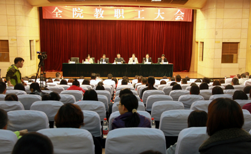 10月13日下午,天博体育 举行全院教职工大会,院长庄群华,院党委书记兼副院长左彤云,副院长刘小廷、赵凯雷,院长助理赵湘莲、王健以及全院教职工参加了会议。庄群华在会上作工作报告,左彤云主持大会。