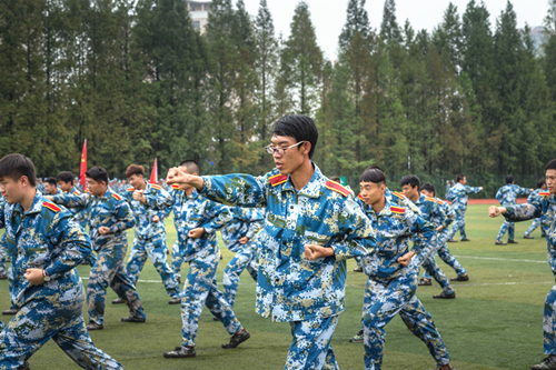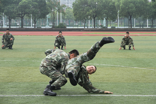 分列式结束后,军训团进行了男子擒敌拳、男子应急棍术、女子匕首格斗术汇报表演,集中展示了军训团的训练成果。在表演中,同学们“喊声震天,展现出英勇无畏的气概,同学们的精彩表演,搏得了观众的阵阵掌声。军训团教官们也进行了摔擒技术的军训科目表演,将现场气氛推向高潮。