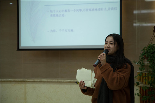根据要求,参与分享活动的同学需选择一本自己读过的书,并思考这本书对自己成长的影响,完成演讲稿的写作,进而完成演讲PPT的制作。同学们在阅读中成长、沉思,并与在座师生分享了自己储存的珍贵的精神食粮,其分享书目是多元的,有我国的优秀作家作品,也有美国或日本的优秀作家作品,有小说、有散文、有杂文、有自传。他们以精心的准备和优秀的表现感染了在场的老师和同学,让阅读成为生命个体在字里行间的另一种行走。