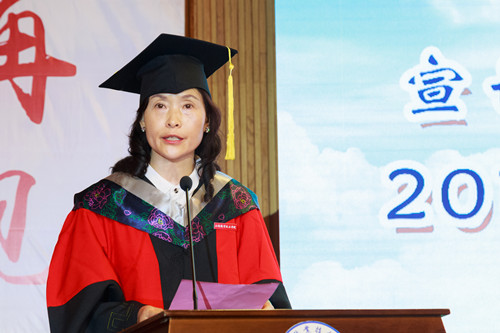 院长庄群华发表了以“做新时代的奋斗者”为主题的讲话,他首先代表学校向全体2018届毕业生圆满完成学业表示热烈的祝贺,他指出,三年来,同学们在学习和生活中创新实践,用实际行动践行了“敏于行,勤于思”的学风,践行了“孝宽诚责毅”的五字文化。作为师长,为同学们所取得的进步与成绩感到骄傲,对同学们为学校的发展所付出的努力与汗水表示感谢。同时,他还对毕业生提出三点希望与嘱托,第一,希望同学们不忘初心,做坚忍不拔的追梦人。要坚定追逐梦想的自信和决心,坚守最基本的价值观,永远保持独立思考,客观地面对现实,理性地对待梦想,在仰望星空的同时,更要脚踏实地,从点滴做起,一步一个脚印,把长远的梦想与短期的目标结合起来,不忘初心,砥砺前行。第二,希望同学们秉承匠心,做本领过硬的能干人。要有追求卓越的态度和止于至善的技艺。任何工作都有一定的规律和遵循,必须保持进取,不断超越,才能有所成就。希望同学们在今后的工作学习中,用工匠精神要求自己、打磨自己,锻造出过硬本领,最终成为某个领域的行家里手。第三,希望同学们永葆好奇心,做创新创业的开拓者。在脚踏实地追寻梦想时,一定要有探索未知的好奇心,要有创新实践的勇气。希望大家在未来的日子里,树立终身学习观念,把握新事物发展脉搏,永远保持不断求索的兴趣,在创新创业的实践中,成就美好未来。