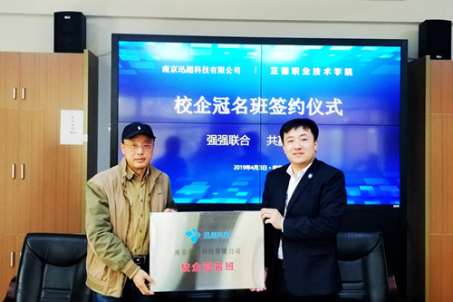在欢快热烈的氛围中,双方共同签署了《“迅超冠名班”校企合作协议》,江国华与祁祺共同为“迅超冠名班”揭牌,开启了校企合作的新篇章。
