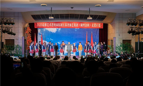 为引领学生弘扬优秀民族文化,丰富天博体育 文化生活,提高学生艺术修养,10月22日晚江苏省扬剧团来到天博体育 ,为师生带来了扬剧《湖湾金秋》。副院长任慈、天博体育 师生代表、军训教官代表近400人共同观看本场演出。