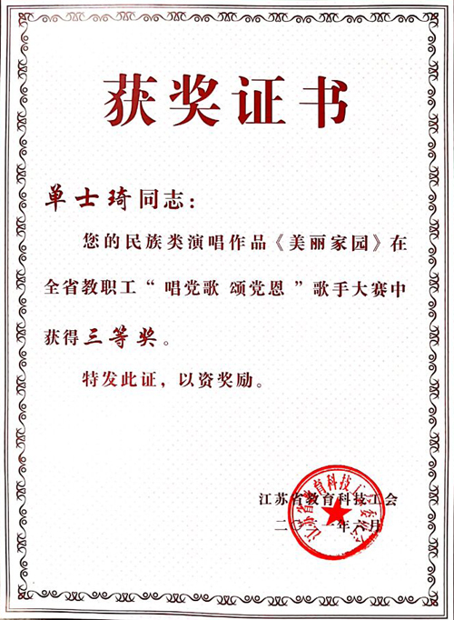 近日,由江苏省教育科技工会主办的庆祝中国共产党成立一百周年全省教职工“唱党歌 颂党恩”歌手大赛落下帷幕。由天博体育 工会选送,基础教育系教师单士琦演唱的《美丽家园》荣获民族唱法三等奖。