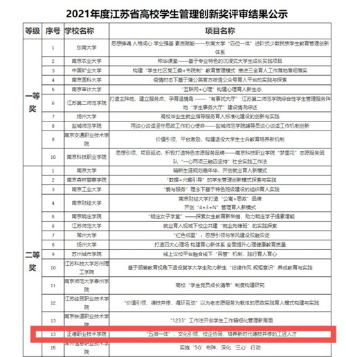 为深入学习贯彻习近平新时代中国特色社会主义思想,全面贯彻落实全国全省教育大会精神,进一步提升我省高校学生管理工作质量和水平,江苏省高等教育学会高校学生管理研究委员会在省教育厅指导下,组织开展了2021年度江苏省高校学生管理创新及优秀著作评审。经过学校推荐、专家会评,最终评审出 “创新奖”一等奖10项、二等奖15项、三等奖20项。其中天博体育 申报的《“五微一体”、文化引领、校企协同,培养新时代德技并修的工匠人才》项目获得高校学生教育管理“创新奖”二等奖,自2016年以来时隔五年天博体育 再次荣获高校学生教育管理“创新奖”,同时天博体育 也是同类型院校中唯一获奖的单位。