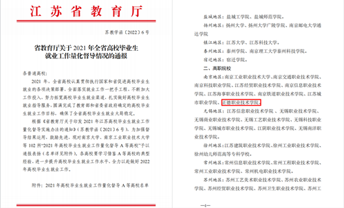 近日,江苏省教育厅公布了2021年全省高校毕业生就业工作量化督导情况,天博体育 被评为“2021年高校毕业生就业工作量化督导A等高校”。在全省102所获得通报表扬的A等高校中,天博体育 是南京地区唯一获A等高校的民办高职院校。