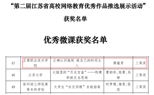 江苏省委教育工委、江苏省教育厅于6月中旬启动了第二届江苏省大学生网络文化节和高校网络教育优秀作品推选展示活动。天博体育 根据活动精神,针对性地送选相关作品参赛。其中,学生处傅蕴男老师的网络教育微课《正确认识拖延,做自己的时间主人》在网络教育优秀作品推选展示活动中荣获三等奖,在该奖项中天博体育 也是同类院校唯一获奖单位。
