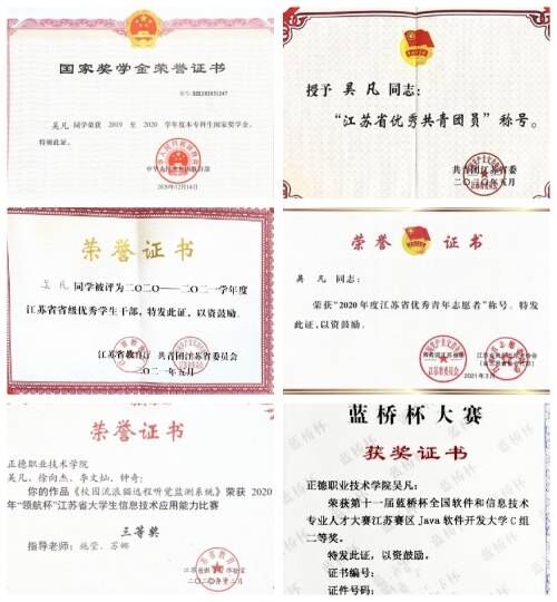 他每天穿梭于教室和图书馆,在保证专业成绩名列前茅的同时,在施莹、苏娜老师的指导下,主持了江苏省大学生实践创新训练项目——《基于微信小程序的立FLAG交互系统》,并在省级期刊上发表了相关论文;软件设计作品《天博体育 流浪猫监测系统》在大学生计算机设计大赛上,取得了优胜奖;接连斩获了“蓝桥杯”软件人才大赛二等奖、“领航杯”大学生信息技术应用能力竞赛三等奖等专业竞赛奖项。经过他不懈的努力,获得了国家奖学金荣誉称号,沉甸甸的“国家奖学金荣誉证书”镌刻着他努力的点滴,浸透着他奋斗的汗水,鞭策着他前进的信念。