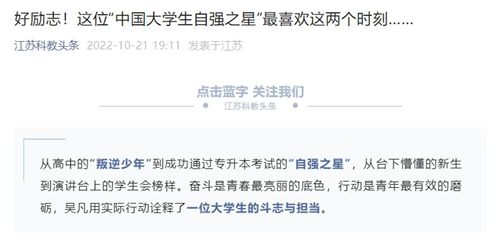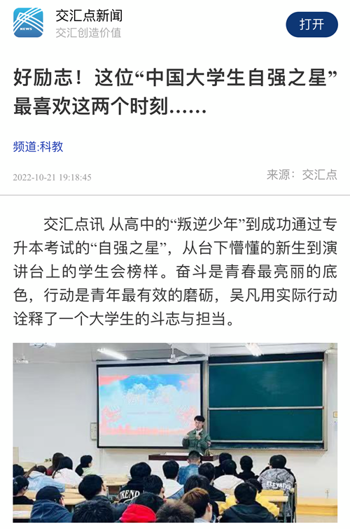 10月21日,新华日报江苏科教头条、交汇点以《好励志!这位“中国大学生自强之星”最喜欢这两个时刻……》为题,对天博体育 电子与信息技术系软件技术专业学生吴凡进行了专题报道。