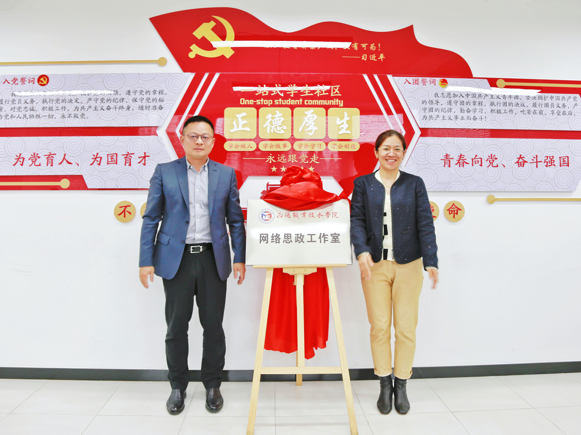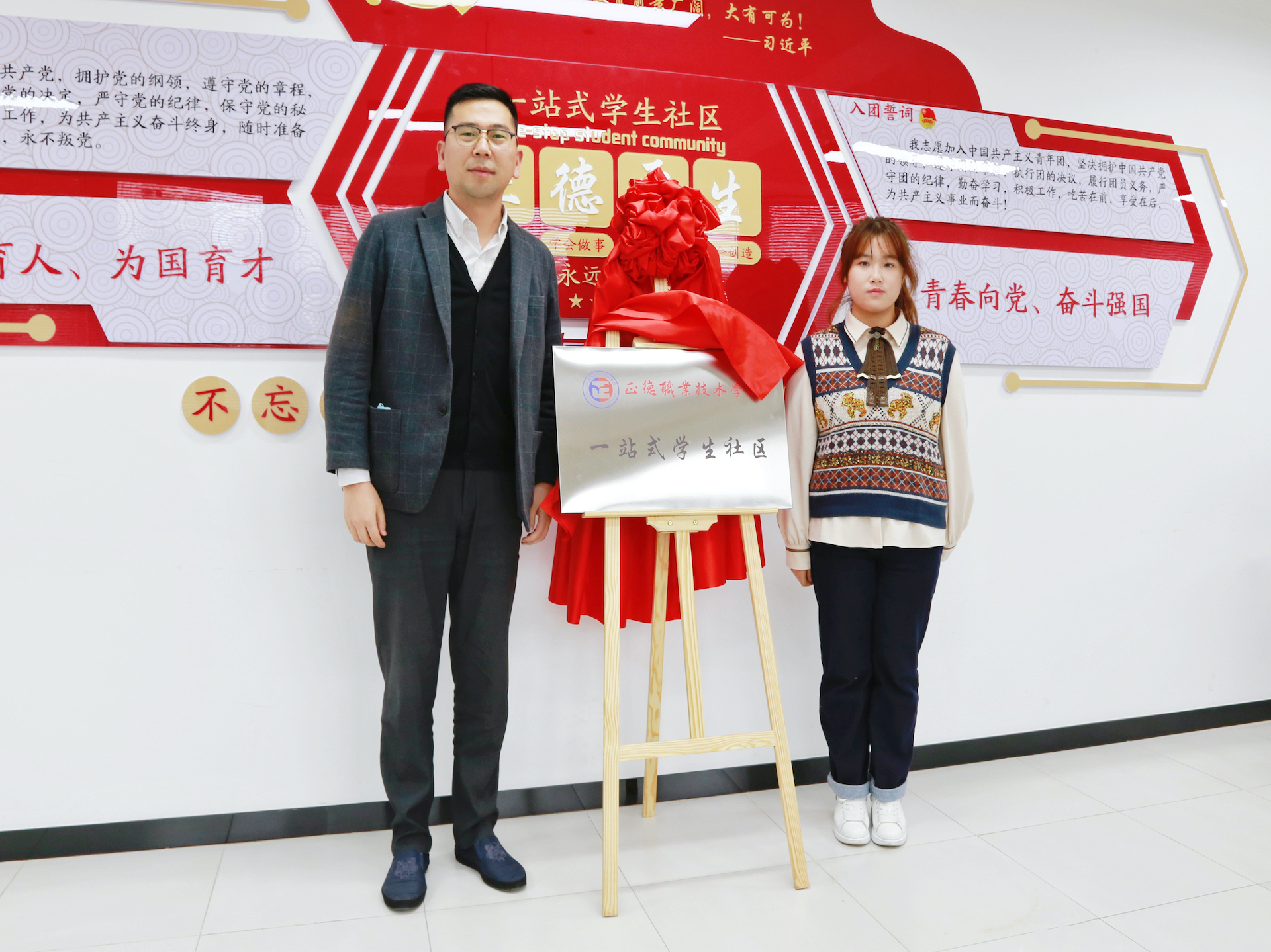 党群工作部部长祖国与“一站式”学生社区楼长、学生代表基础教育系赵熠绚同学共同为“一站式”学生社区揭牌。