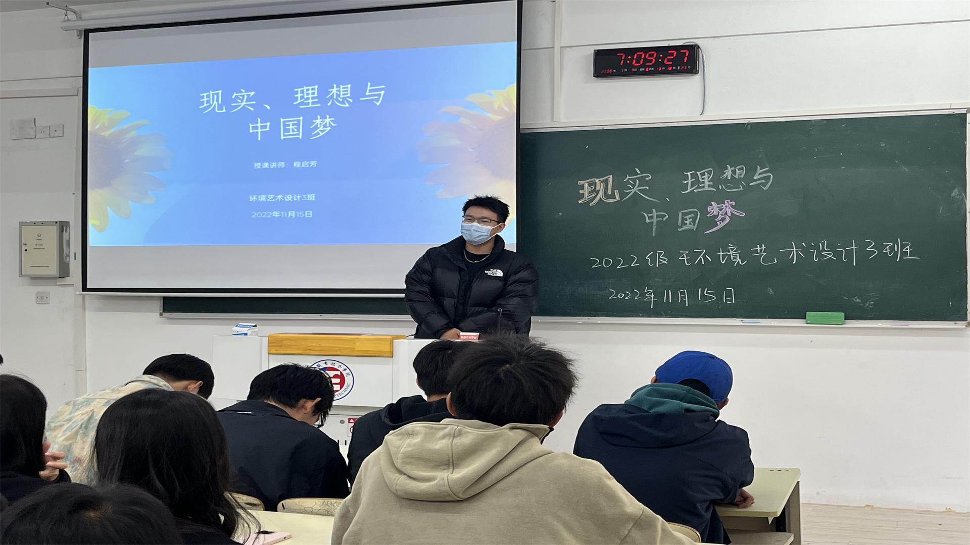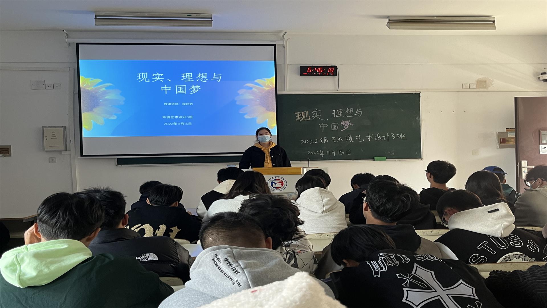 为引导我系学生树立“四个正确认识”,在把握理想与现实、个人理想与社会理想的关系基础上,深入认识和理解理想、信念的科学涵义,理解确立坚定的理想信念对成长成才的重要意义并能够增强将个人的青春梦想融入到为实现中华民族伟大复兴的中国梦而奋斗的责任感与使命感,在11月15日,艺术设计与建筑工程系的环境艺术设计3班全体同学在2305教室开展了“现实、理想与中国梦”主题思政课。