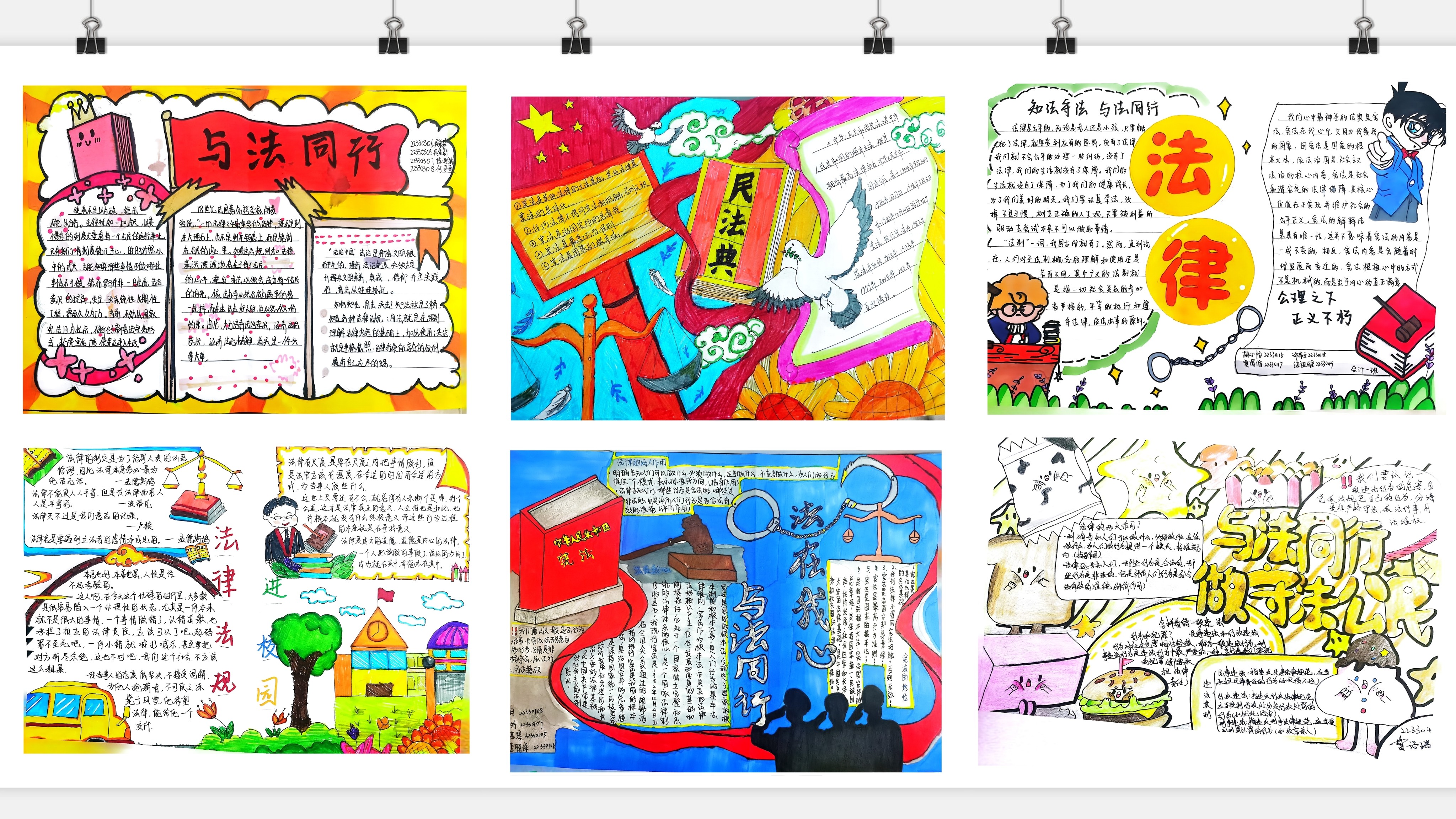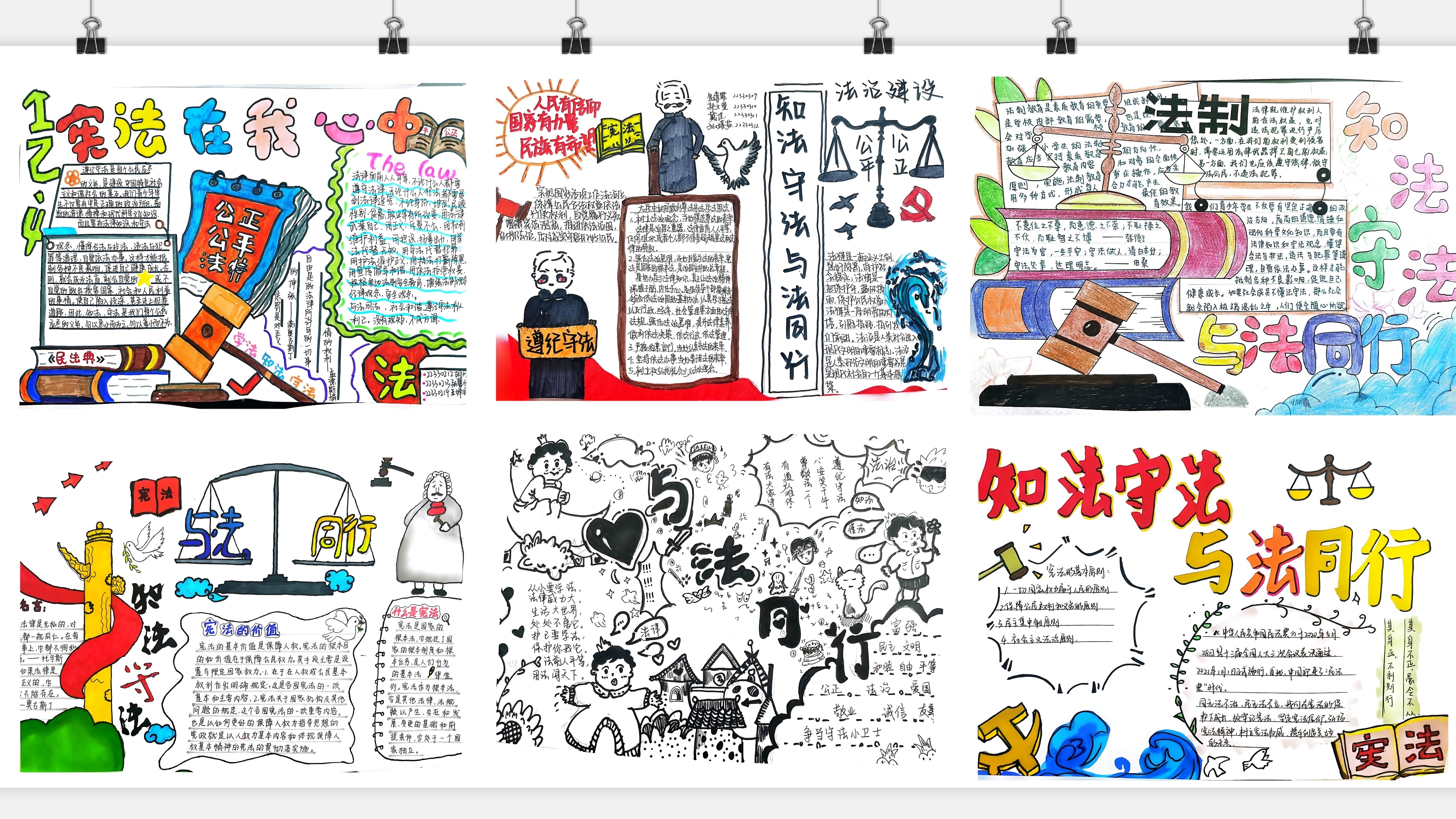 学生们充分发挥自己的艺术思维能力,运用通俗易懂的语言和生动的画面来描述宪法的地位、学法懂法的意义、大学生学法的具体举措等内容,将所见所感所想呈现于纸上。一张张手抄报图文并茂、色彩丰富,展现着青年学生尊崇宪法、积极向上的精神风貌。