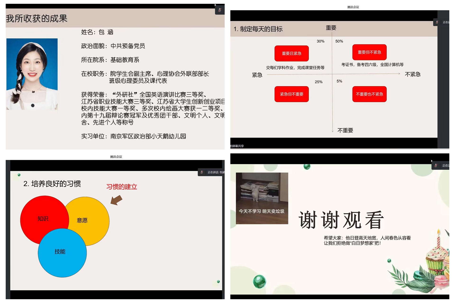 为进一步组织引导广大青年深入学习贯彻党的二十大会议精神,基础教育系团总支于11月29日开展了“向白日梦想家say no”信仰公开课。此次信仰公开课分为经验分享交流和梦想公开课两个部分。本次活动由2019级优秀毕业生包涵同学主讲。在向同学们传达新时代新青年新思想的提升要求的同时,鼓励同学们不断提升完善自己,帮助我系青年学生培育和践行社会主义核心价值观。