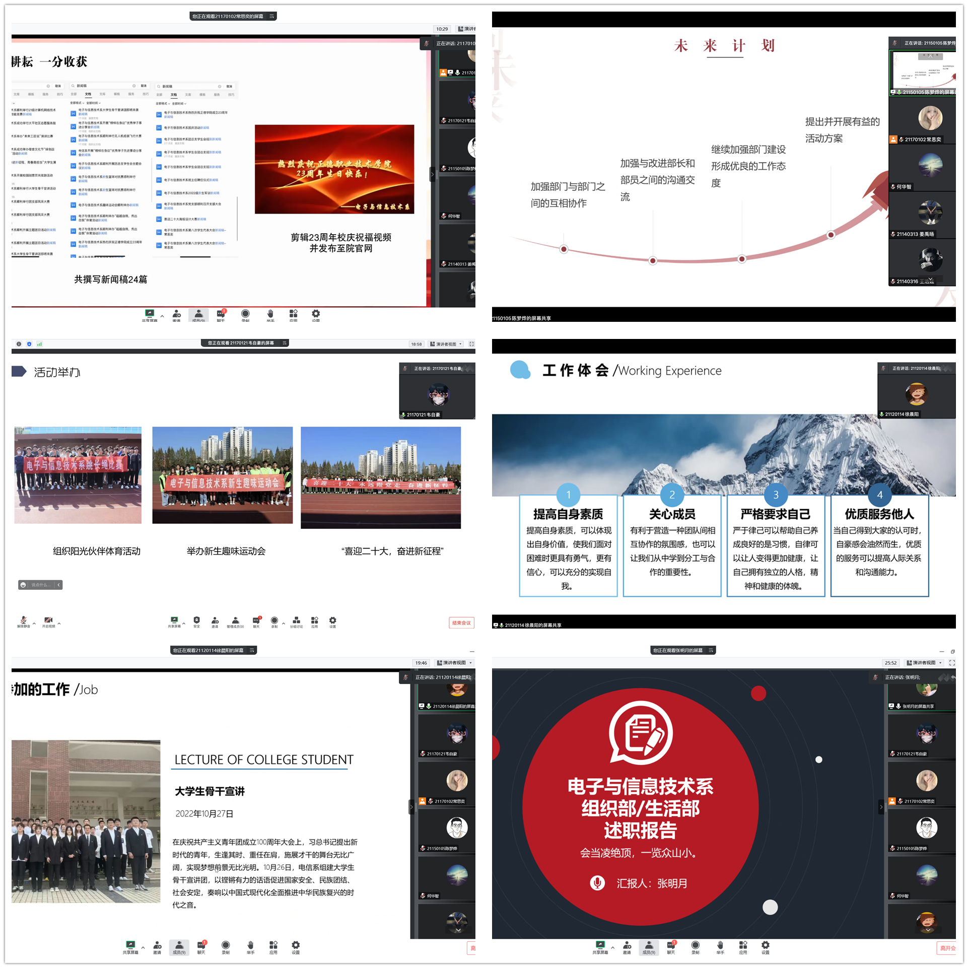 电子与信息技术系团总支学生会各成员以PPT汇报的形式阐释了日常工作要点,以道德品行建设、工作成效回顾、未来工作展望等方面进行全面汇报,就工作中遇到的问题提出了进一步的解决方案,回顾过去的成就与不足,并就下学期重点工作作出展望。