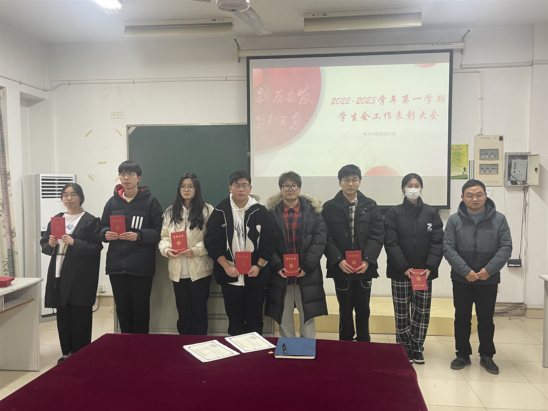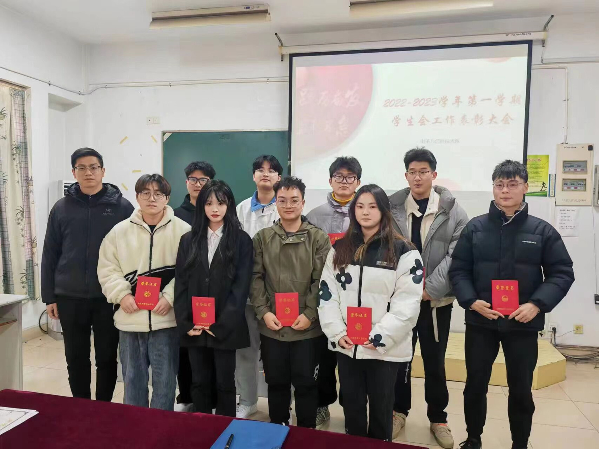 会议开始,赵欣向电信系学生会成员提出新学期的要求与期盼,希望学生会全体成员在新的学期能够全心全意为同学服务,在实践中锻炼自己。接着,何华智向参会成员进行上一学期工作总结,并悉心指出工作中存在的问题与不足,向同学们提出意见与要求。最后,常思奕公布2022-2023学年第一学期 “优秀干事”和“优秀学生干部”名单,赵欣、何华智分别为获奖同学颁奖并进行合影留念。