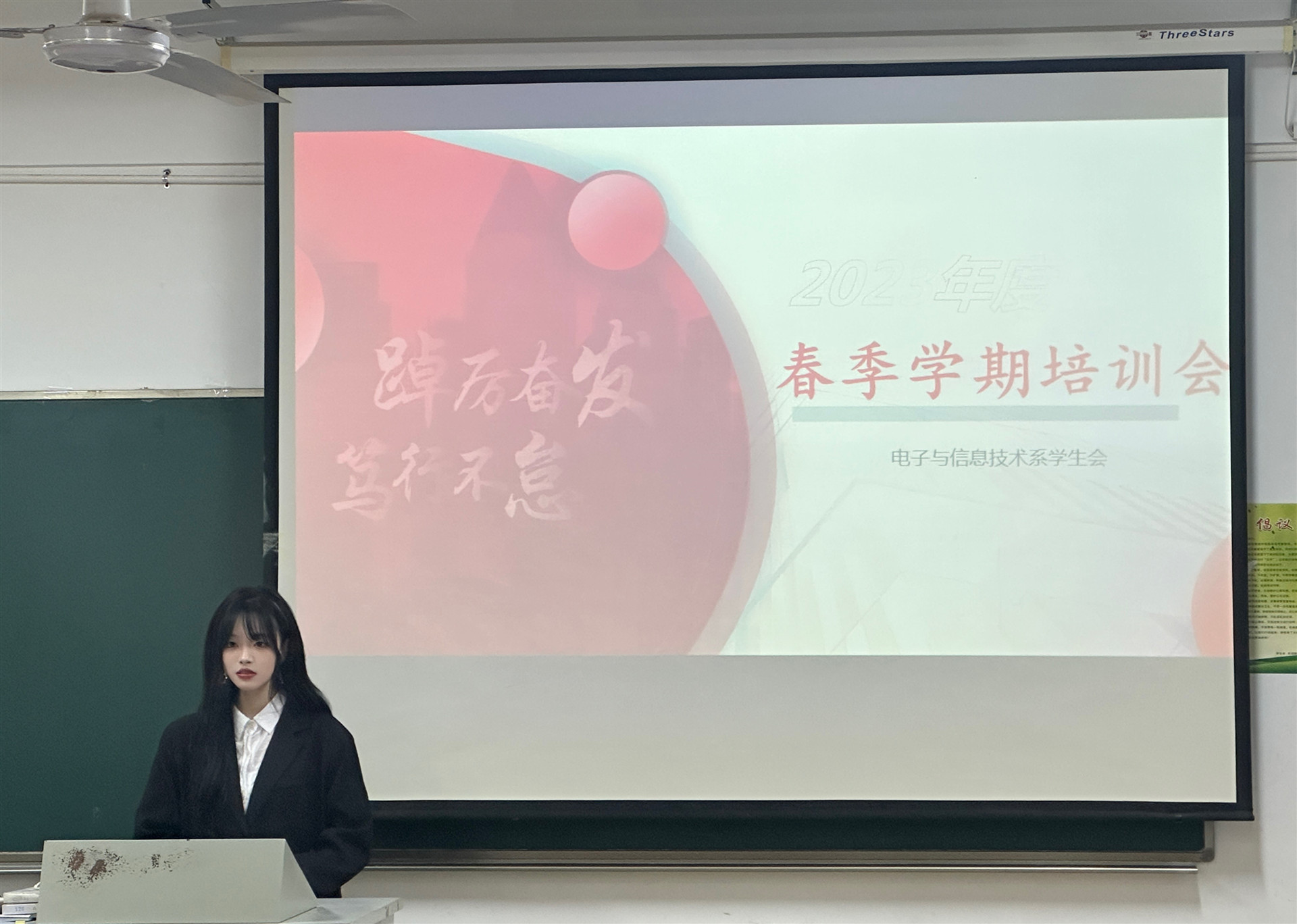 表彰大会结束后,常思奕对学生会成员进行培训,她分别从上学期工作总结、新学期工作规划及新学期希望与要求三个方面向同学们进行交流培训,她带领同学们集体学习了《关于学联学生会工作人员改进作风服务同学的若干规定》,希望同学们以此为行为准则,在新的学期为电信系发展带来新活力。