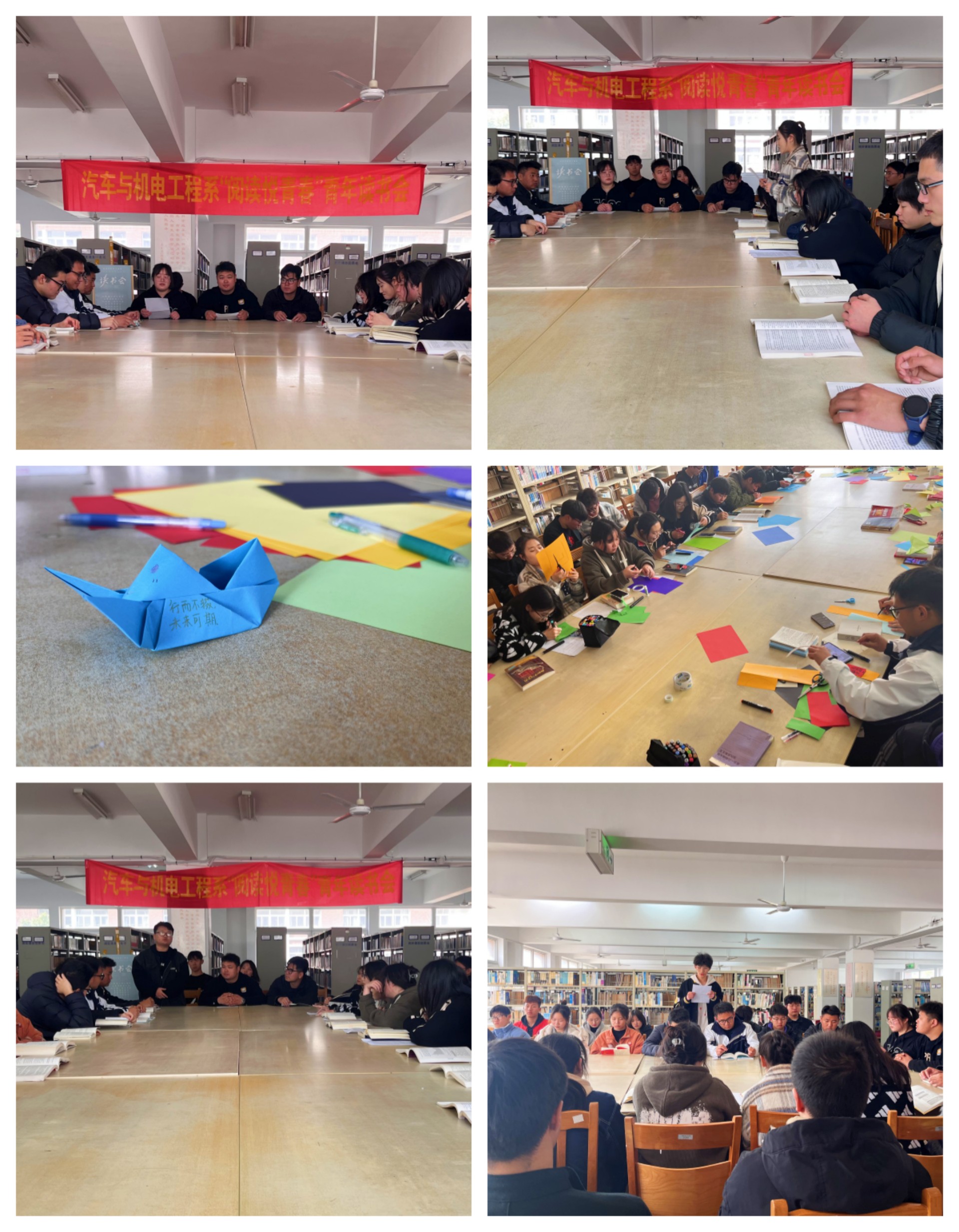 为学习贯彻党的二十大精神,激发同学们的爱国爱党热情,让同学们在阅读中寻找灵感,在交流中碰撞出思想的火花,鼓励汽车与机电工程系学子在阅读中增强文化自信,深耕文化底蕴,提升文化素养。2023年3月2日下午,汽车与机电工程系于天博体育 图书馆开展“阅读悦青春,逐梦新征程”读书分享会,汽机系学生会成员及部分22级同学参加活动。