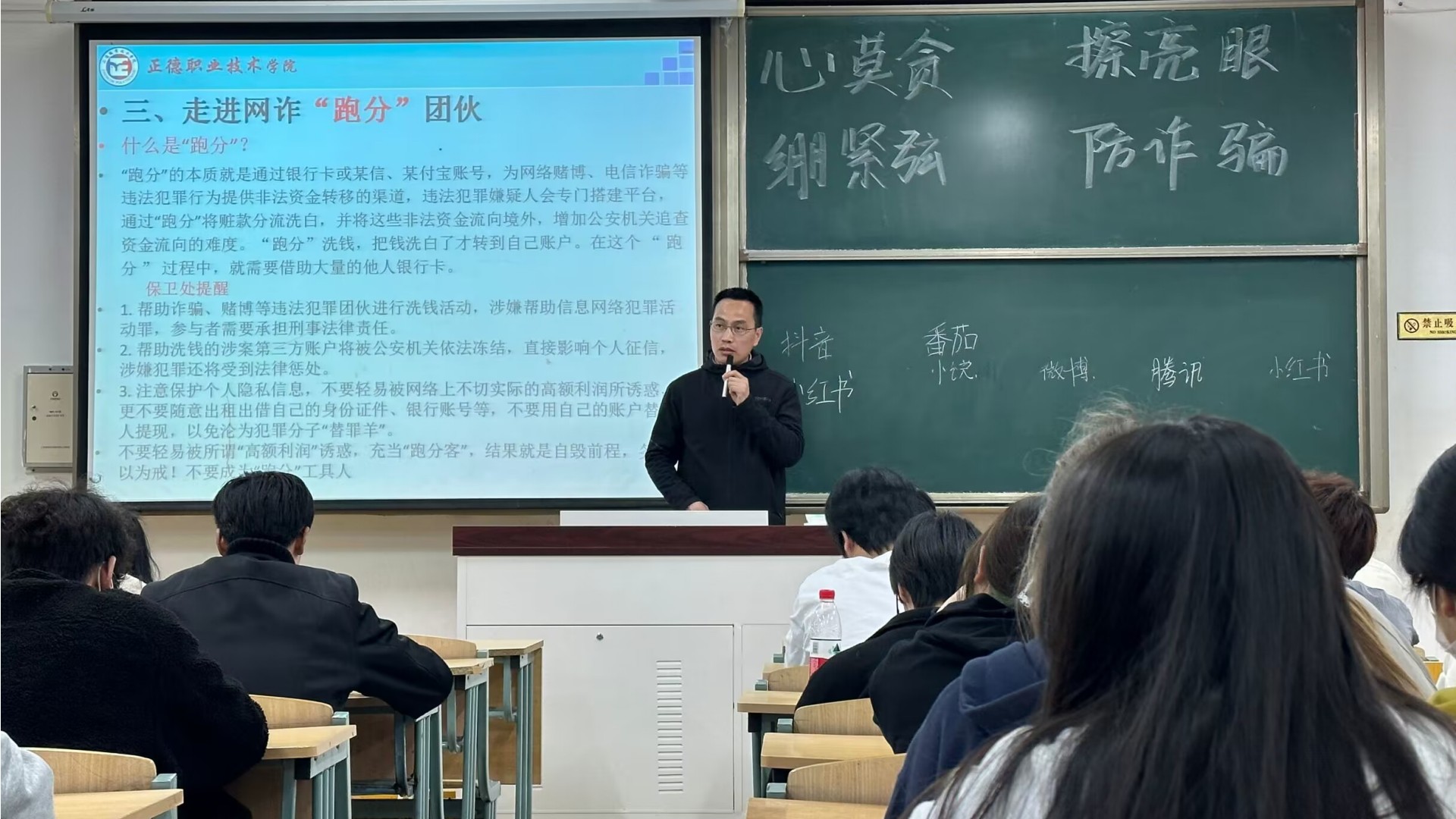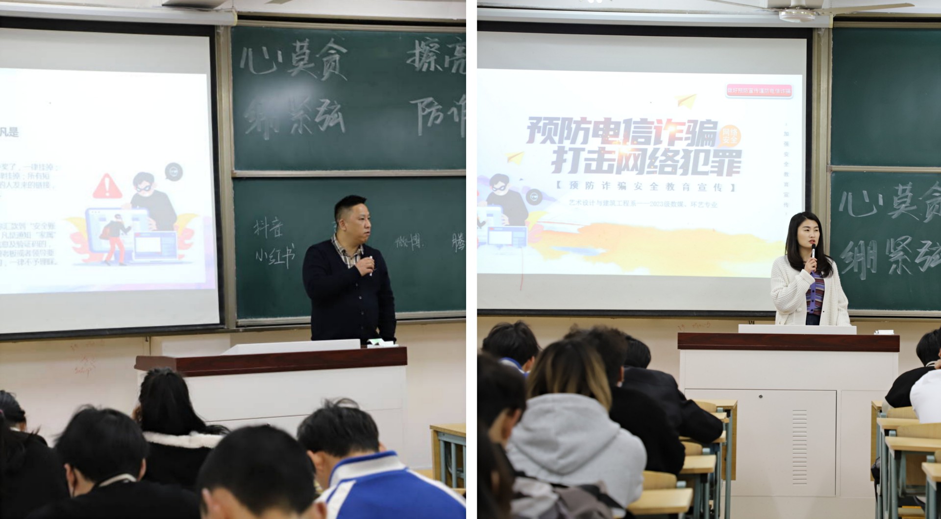 为进一步提升天博体育 学生防范电信诈骗违法犯罪意识,有效遏制电信诈骗高发事态,切实保障广大学生群体的财产安全,加强学生管理,在天博体育 贷、网络方面进行引导。环艺、数媒专业22级学生3月6日下午在9308教室,召开了关于防电信诈骗的主题班会。辅导员廖晶晶、党支部书记陈宏波参会,特别邀请了保卫处副处长丁胜做主要宣讲。