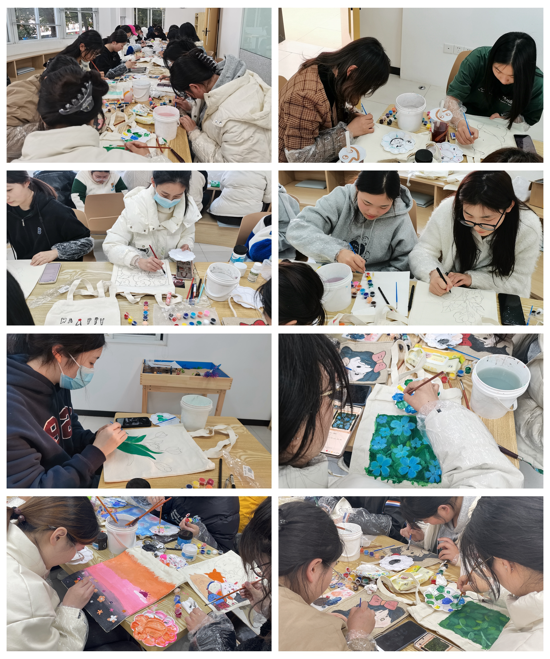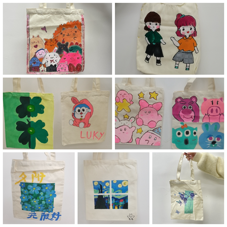 部分同学在教室、宿舍里也开始制作,活动中,同学们发挥着自己的奇思妙想和艺术灵感,每一笔线条、每一抹色彩都是对美好生活最生动的诠释,满满手作温情,增添了斑斓的色彩。经过几小时的涂色,大家都完成了属于自己的作品:字母文字图案的帆布包,简约大方,张扬个性;风景、人像图案的帆布包,简约中透着特别,诠释不一样的自己;动物简笔画图案帆布包,清新呆萌。小小的帆布包,在此刻不只是简单的装载物品,还是自己创意的体现。