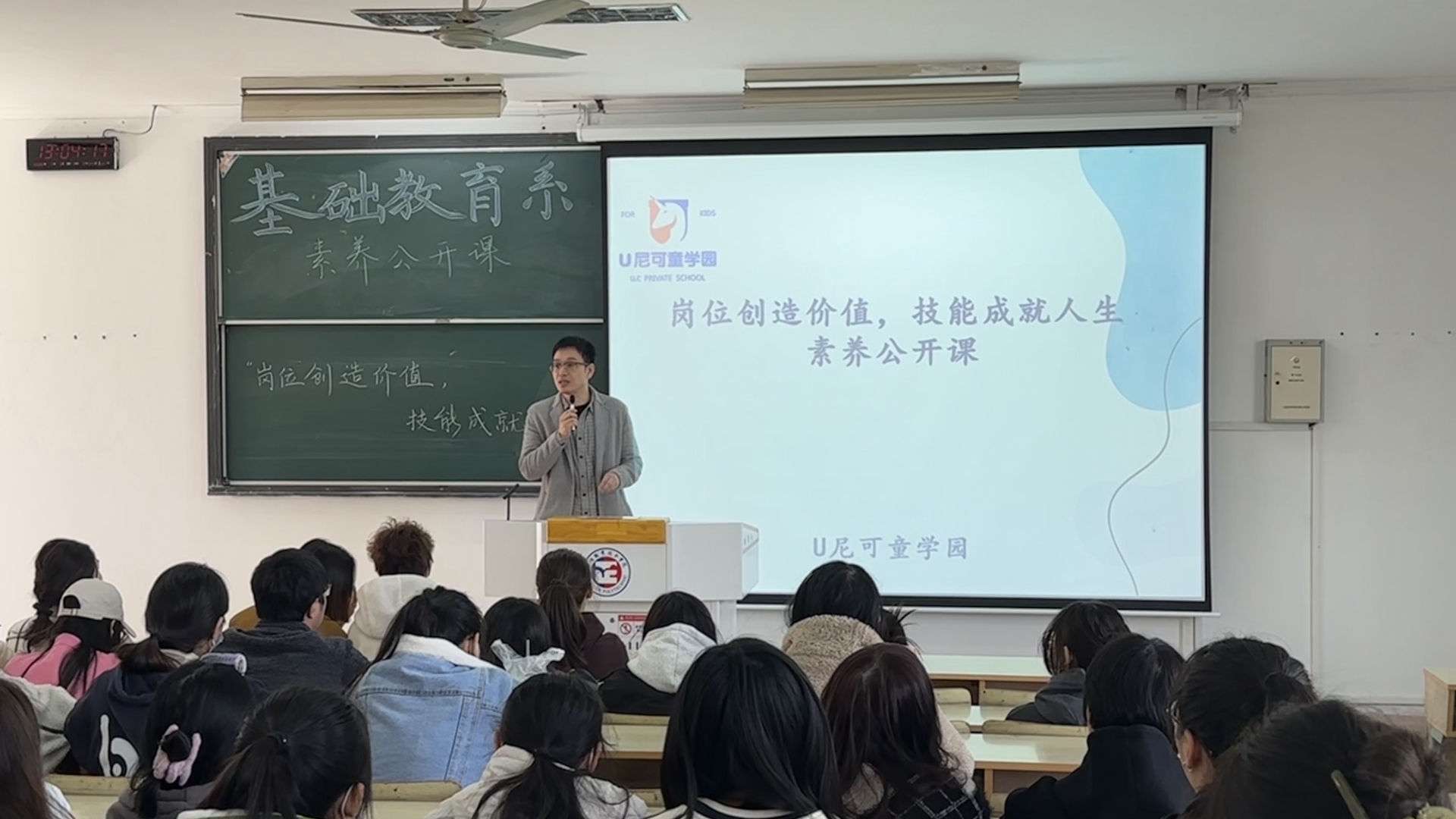 为了促进我系校企合作,加强与企业以及校友的沟通,同时让同学们学到更多的专业知识,提升职业素养,调动同学们的学习积极性,我们特地邀请了U尼可童学园的创始人孔总、执行校长周校长,以及我们的优秀毕业生金嘉程前来,开展以“岗位创造价值,技能成就人生”为主题的讲座。基础教育系主任杨晶、基础教育系党支部书记杨春娟和全体辅导员参加本堂素养公开课。